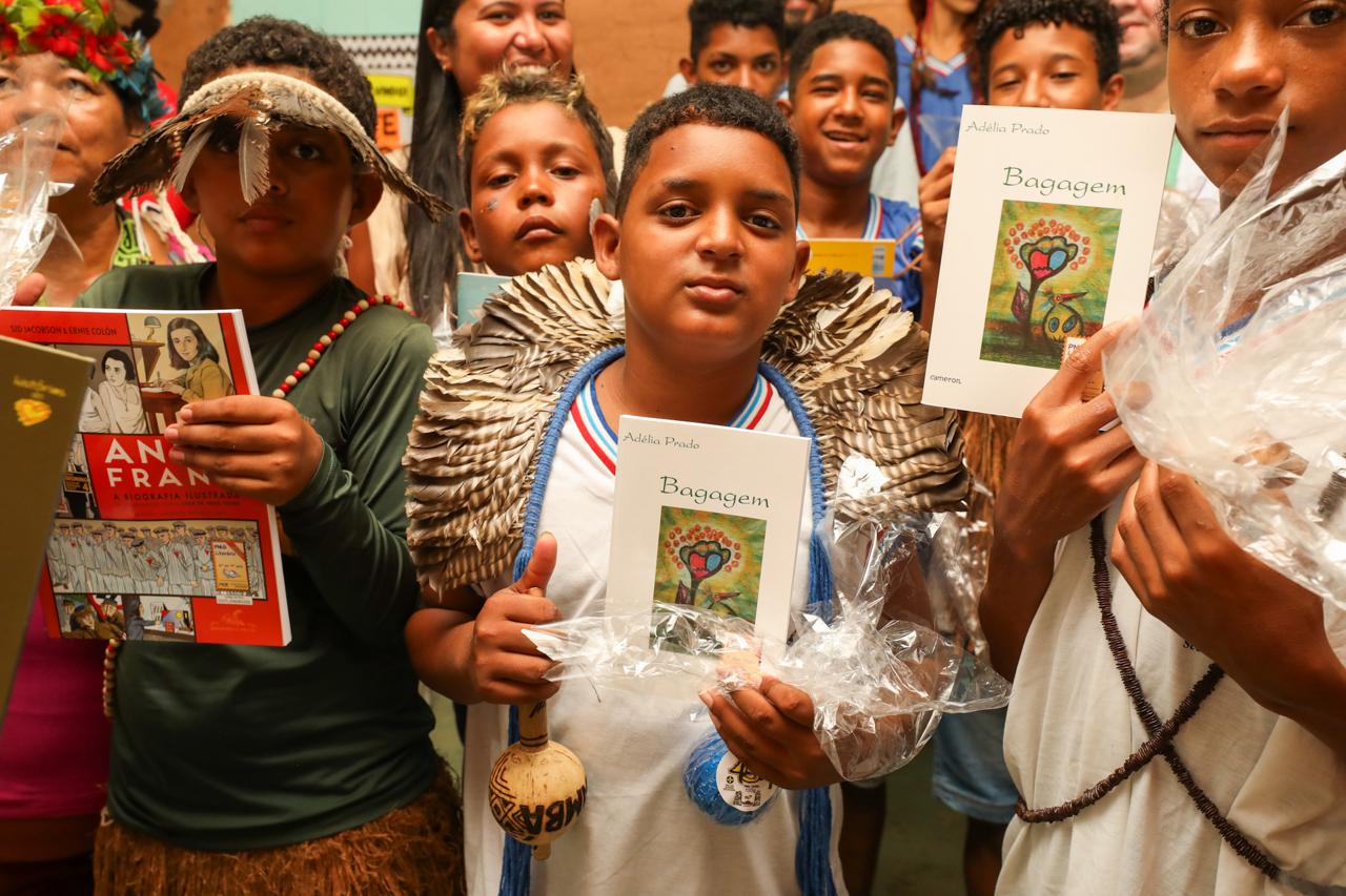 Cada escola recebeu 380 exemplares de gêneros e temas variados, contemplando desde obras clássicas até literatura contemporânea. Îã Gwarini Tupinambá, professora de Artes, Identidade e Cultura e Tupi, do Colégio Estadual Indígena, ressaltou a importância do contato com os livros físicos. “O nosso colégio sempre trabalhou muito a questão da oralidade. Mas, com o passar dos anos, identificamos que a gente também precisa do letramento e os livros de literatura ajudam muito com isso. Nós falamos muito que, hoje em dia, o nosso arco e a nossa flecha são a caneta e o papel, pois até para lutar temos que ter uma boa escrita e leitura. A literatura tem ajudado muito a desenvolver os pensamentos e o raciocínio lógico dos nossos alunos. Então, esses livros chegaram em um bom momento e serão muito utilizados por eles”, pontuou a professora.
