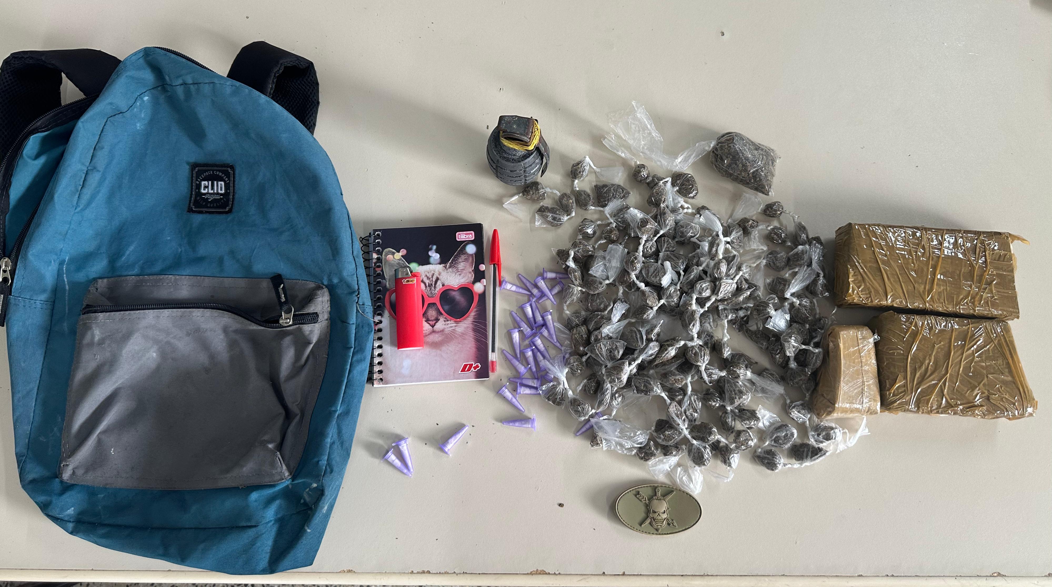 Dois tabletes de maconha, dezenas de porções da mesma droga, 25 pinos de cocaína, uma granada e um caderno de anotações foram apreendidos com um homem suspeito de gerenciar o tráfico de entorpecentes na localidade conhecida como Goro de Itinga.