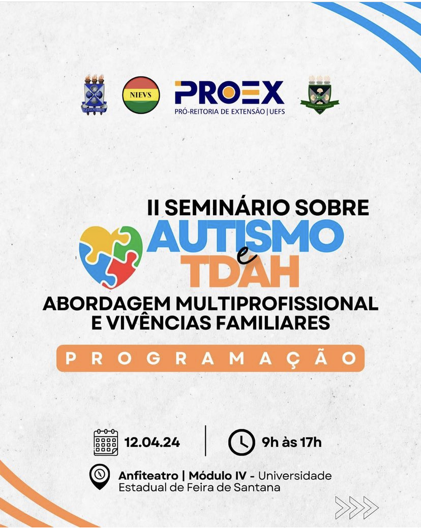 Será realizado no dia 12 de abril no anfiteatro do módulo 2 da Universidade Estadual de Feira de Santana (Uefs) o evento “Autismo e TDAH: abordagem multiprofissional e vivências familiares”. Coordenado pelo Núcleo Interdisciplinar de Estudos sobre Violência e Saúde (NIEVS), o encontro tem o apoio do Núcleo de Acessibilidade (NAU-Uefs) e do Núcleo de Apoio Psicossocial e Pedagógico (NAPP-Uefs). Os interessados devem entregar no dia do evento brinquedos ou jogos pedagógicos para participar da atividade.
