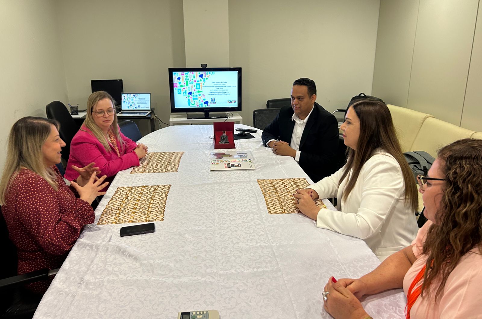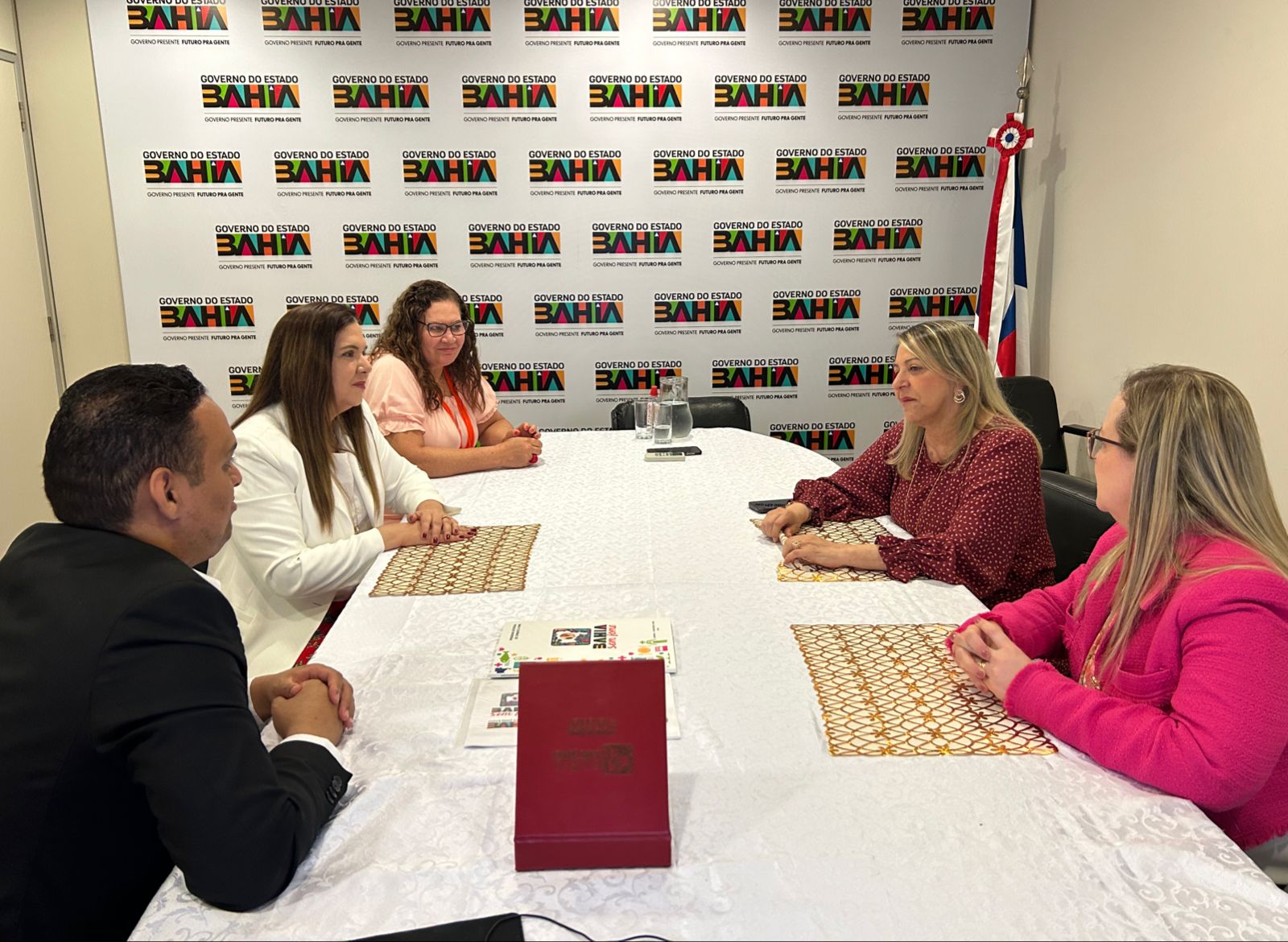 Também estiveram presentes à reunião a primeira-dama do Estado da Bahia, professora Tatiana Velloso, a chefe de gabinete da Presidência do TJBA, Maria Paula Carvalho e a coordenadora do escritório de representação do Governo da Bahia, Elisabete Costa.