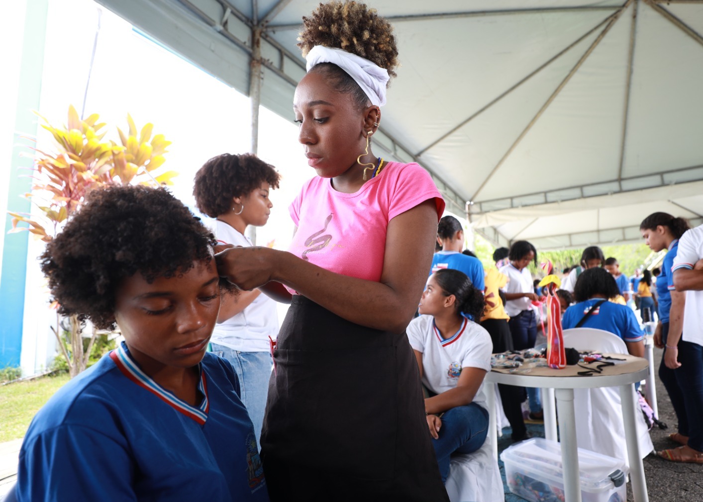 Enquanto os alunos indígenas também tinham experiências em um espaço urbano, diferente da escola na qual estudam, estudantes da zona urbana aproveitavam para experimentar outras possibilidades. Matriculada no 1º ano do Ensino Médio do IAT, Yasmin Silva, 16 anos, aproveitou para fazer um penteado com tranças afro. “Isso é muito bom para a gente conhecer novas coisas, principalmente o afro”, declarou.