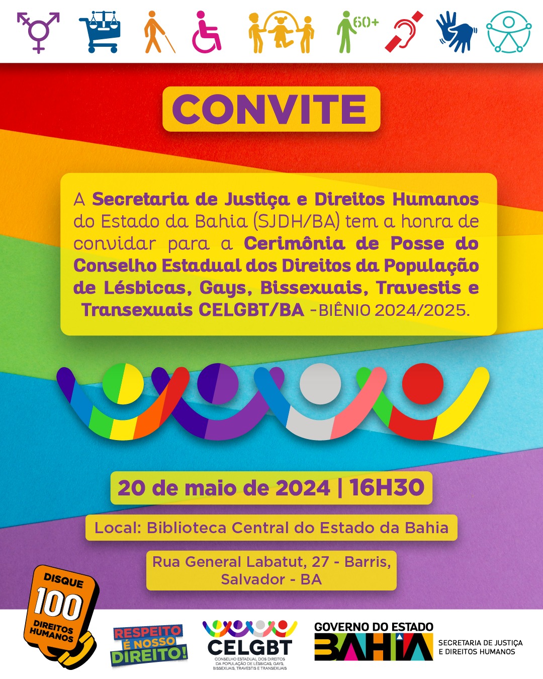A nova composição do Conselho Estadual dos Direitos da População de Lésbicas, Gays, Bissexuais, Travestis e Transexuais (CELGBT) para o biênio 2024-2025, será empossada na próxima segunda-feira (20), às 16h30, na Biblioteca Central do Estado, em Salvador. A cerimônia contará com a presença do secretário de Justiça e Direitos Humanos (SJDH), Felipe Freitas, e marca a retomada da participação popular nas discussões relacionadas às políticas públicas voltadas para este público no estado.