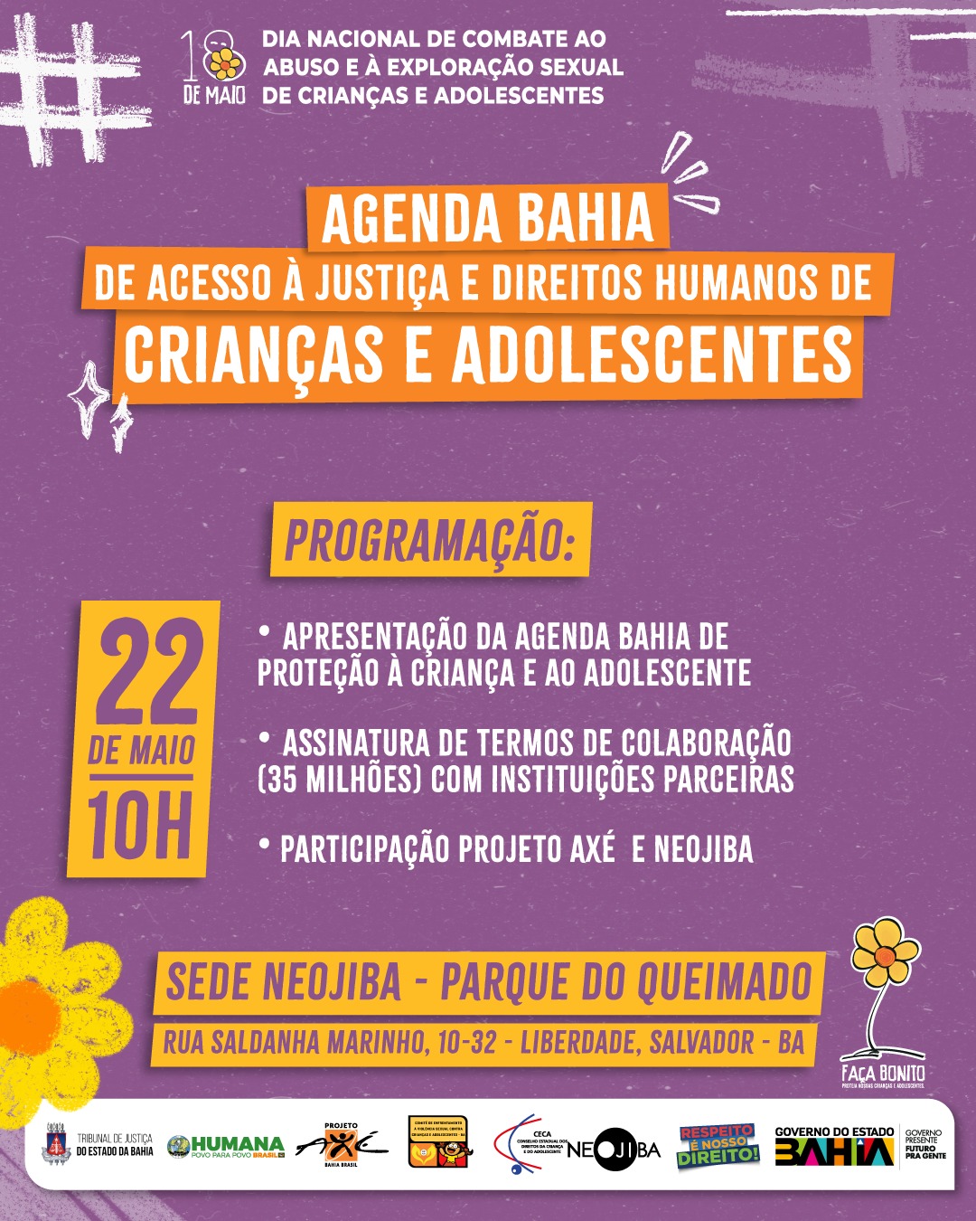 O encontro será realizado às 10h, no Parque do Queimado, sede do projeto Neojiba, em Salvador. Política ampla, a Agenda Bahia de Proteção a Crianças e Adolescentes contempla variadas áreas que incidem sobre a proteção do público infantojuvenil. Ao todo, oito termos de colaboração serão assinados, somando o montante R$ 45.320 milhões.
