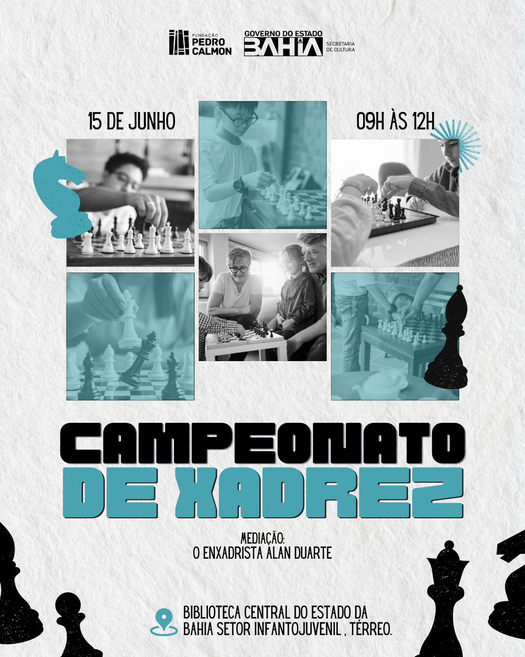 O xadrez é um jogo que envolve estratégia, raciocínio lógico e, sobretudo, pensamento rápido para prever jogadas. Para os amantes do jogo ou para quem tem vontade de aprender, a Biblioteca Central do Estado da Bahia (BCEB), unidade da Fundação Pedro Calmon (FPC/Secult-BA), promove no próximo sábado (15), das 9h às 12h, Campeonato de Xadrez.