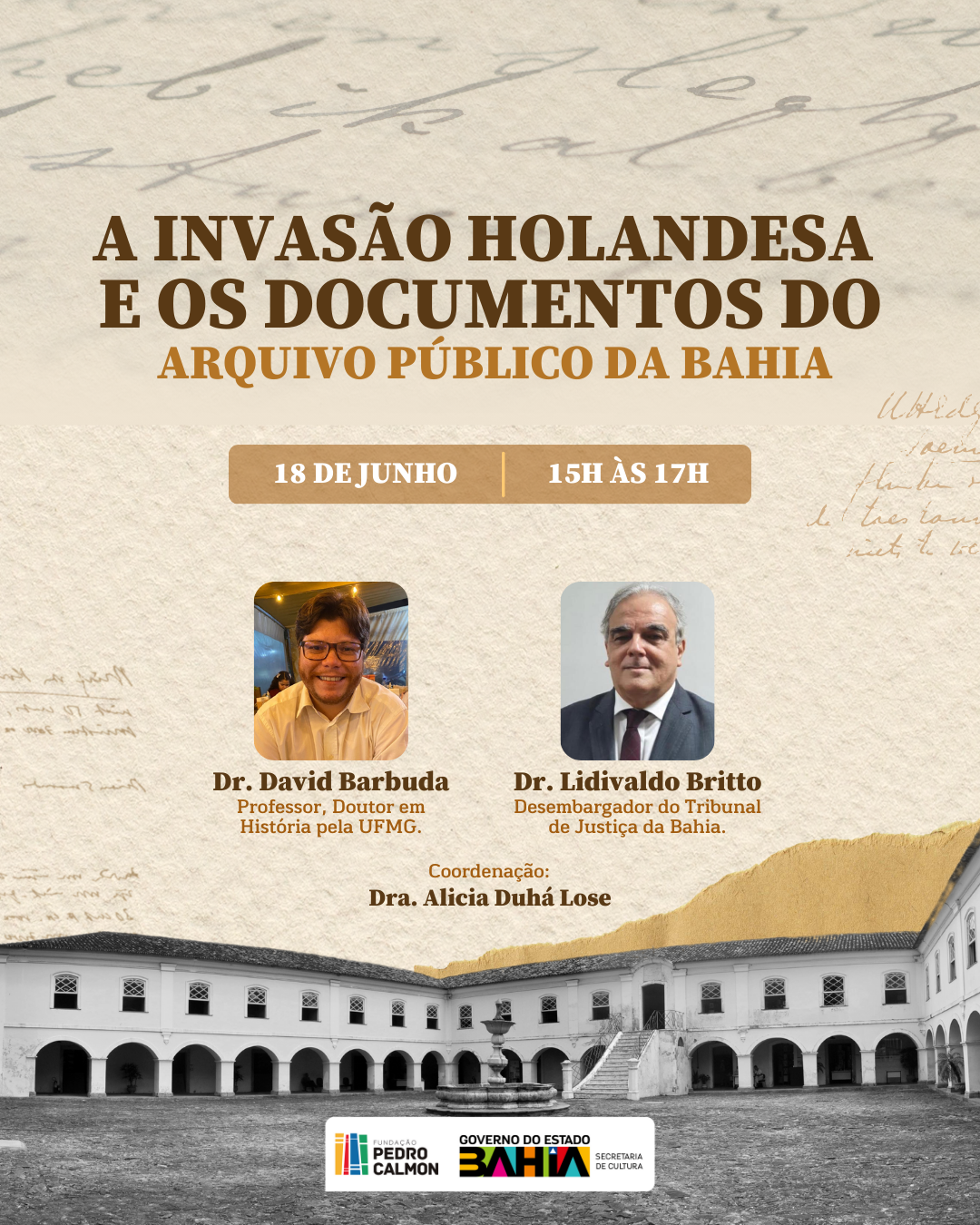 A Fundação Pedro Calmon (FPC/Secult-BA), promove a palestra "A invasão Holandesa e os documentos do APEB", no auditório do Arquivo Público do Estado da Bahia. O evento acontece no dia 18 de junho, das 15h às 17h, com a participação do Desembargador do Tribunal de Justiça da Bahia, Dr. Lidivaldo Britto e do Professor Dr. David Barbuda. A mesa terá a mediação da Profa. Dra. Alícia Duhá Lose, paleógrafa e filóloga da Universidade Federal da Bahia