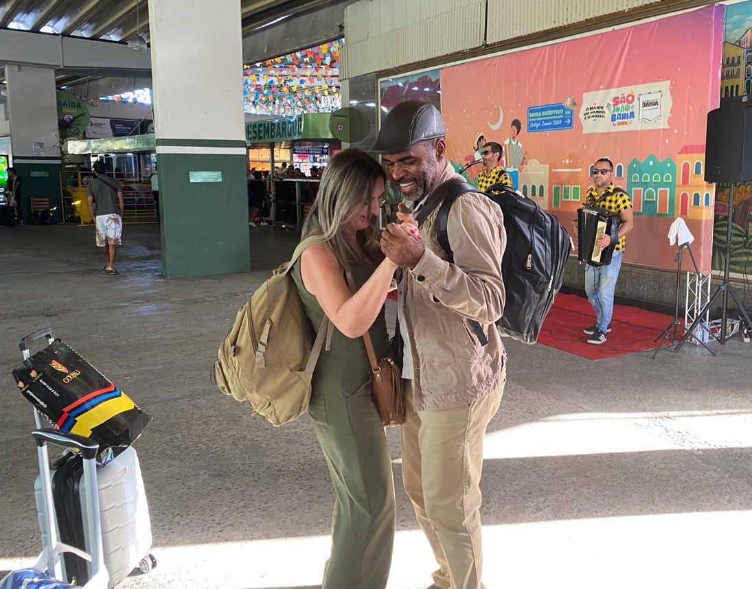 As pessoas que pegaram a estrada para curtir o São João da Bahia, em Salvador e municípios próximos, tiveram uma surpresa na quinta-feira (20), no setor de desembarque da rodoviária da capital. Assim que desceram dos ônibus, elas se depararam com um trio de forró pé de serra que animava o espaço, tocando sucessos juninos. Os mais descontraídos dançaram e tiraram fotos. O receptivo especial da Secretaria de Turismo do Estado ( Setur-BA) foi montado para acolher com alegria visitantes brasileiros e estrangeiros.