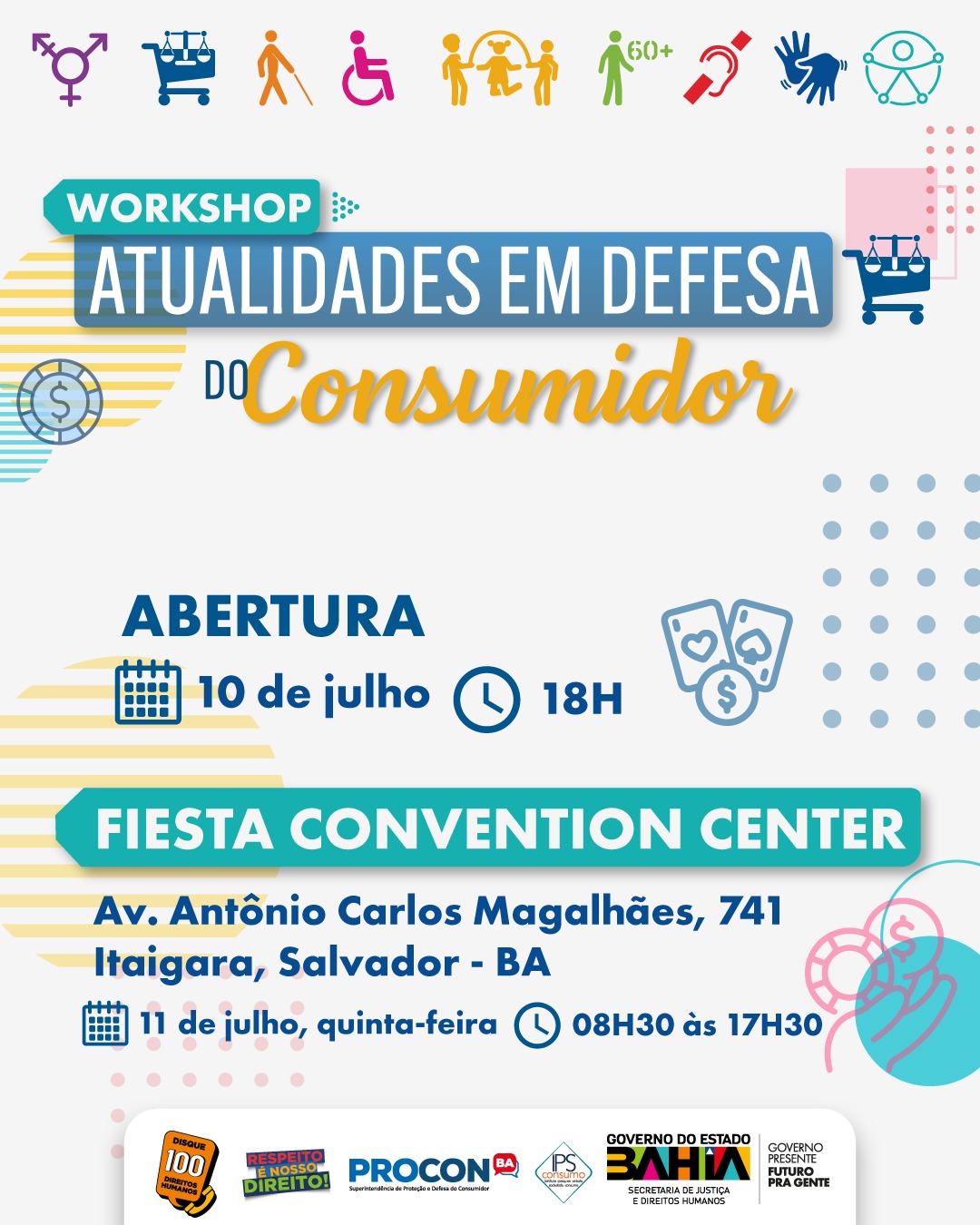 O evento é promovido pelo Procon-BA, órgão da Secretaria de Justiça e Direitos Humanos (SJDH), em parceria com o Instituto de Pesquisas e Estudos da Sociedade e Consumo(IPS Consumo). O objetivo é promover um debate com especialistas sobre as principais questões da área na contemporaneidade, visando à elaboração de políticas públicas de proteção e defesa do consumidor.