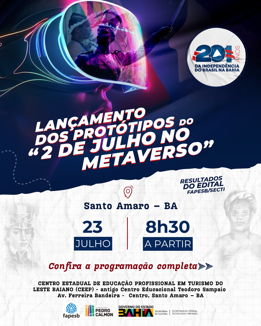 Em celebração aos 201 anos de Independência do Brasil na Bahia, a Fundação Pedro Calmon, está realizando o Projeto Bahia: Memórias de Lutas e Liberdade. Dessa vez, as atividades acontecem no Centro Estadual de Educação Profissional em Turismo do Leste Baiano (Ceep), no dia 23 de julho, a partir das 8h30, em Santo Amaro. Durante o evento, protótipos dos games imersivos em fase de desenvolvimento, criados por pesquisadores de todo o estado para o Edital 2 de julho no Metaverso, financiados pela Fundação de Amparo à Pesquisa da Bahia (Fapesb), vinculada à Secretaria de Ciência, Tecnologia e Inovação (Secti), serão apresentados aos jovens estudantes.