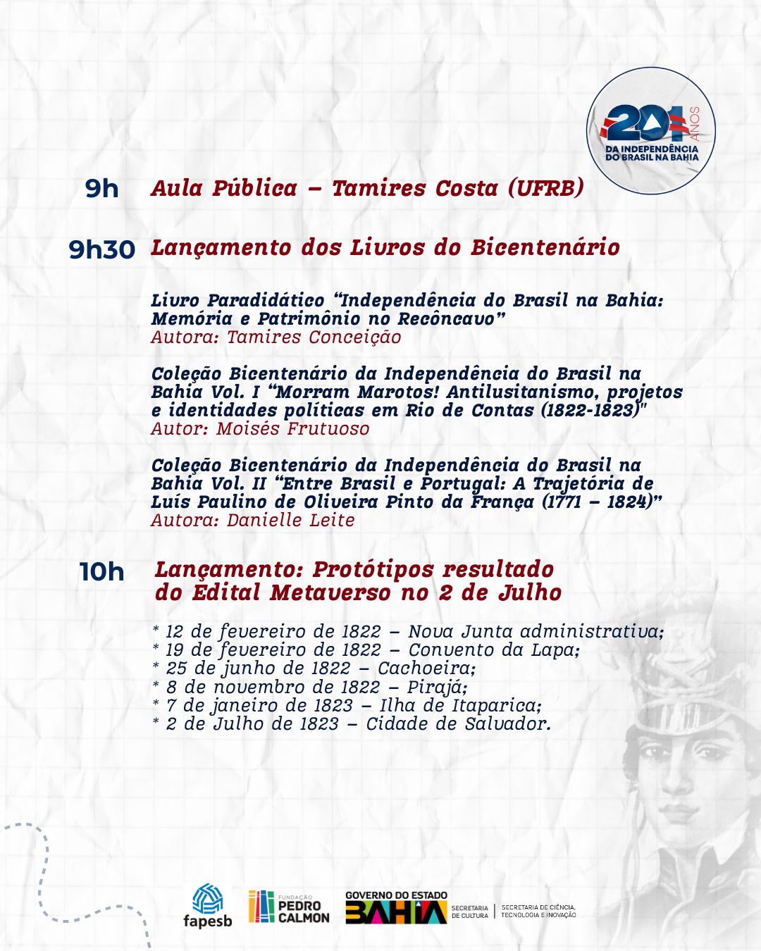 A programação conta ainda com mesa de Lançamento dos Livros Paradidático 'Independência do Brasil na Bahia: Memória e Patrimônio no Recôncavo; Coleção Bicentenário da Independência do Brasil na Bahia Vol. I “Morram Marotos! Antilusitanismo, projetos e identidades políticas em Rio de Contas (1822-1823); Coleção Bicentenário da Independência do Brasil na Bahia Vol. II “Entre Brasil e Portugal: A Trajetória de Luís Paulino de Oliveira Pinto da França (1771 – 1824)”, com a presença dos autores e organizadores: Tamires Conceição, Moisés Frutuoso, Danielle Leite, Sérgio Guerra Filho e Lina Aras.