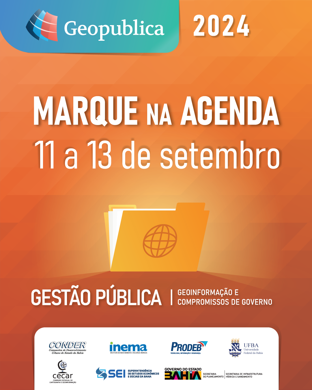 Vem aí o Geopublica 2024, encontro anual de produtores e usuários de geoinformação do estado da Bahia. Em sua 13ª edição, o evento, que se consolidou como referência no calendário nacional do segmento, abordará o temaGestão pública: geoinformação e compromissos de governo, de 11 a 13 de setembro, em Salvador.