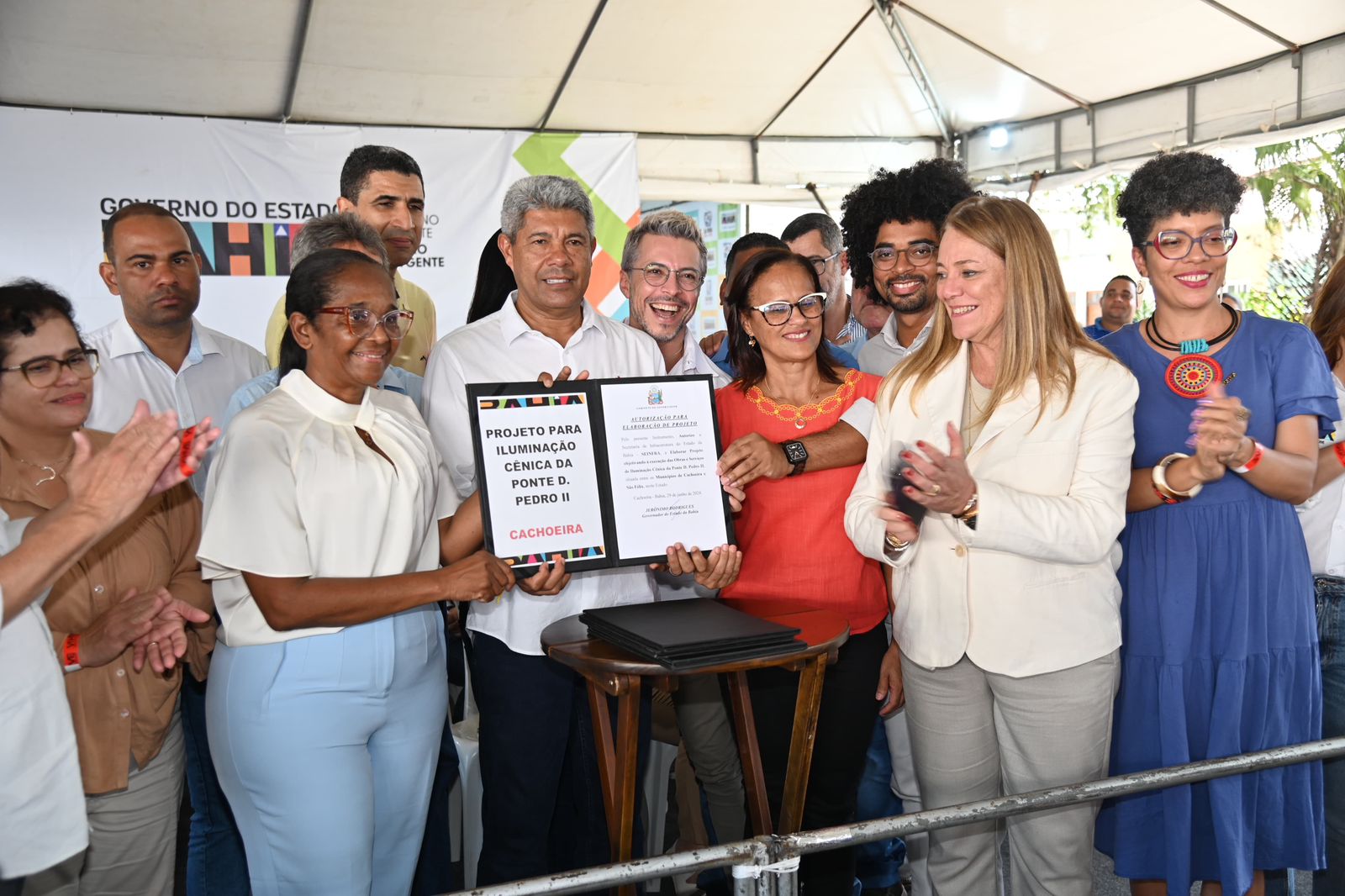 Em visita à cidade de Cachoeira, localizada no Recôncavo baiano, na manhã do úlitmo sábado (29), o governador Jerônimo Rodrigues, anunciou, entre outras ações, a autorização para a elaboração do projeto de iluminação cênica da Ponte Dom Pedro II. A iniciativa atende a um pedido da comunidade, feito por meio da Carta de Cachoeira, em 25 de junho do ano passado. Além da presença de moradores e autoridades, participaram do ato o secretário de Cultura do Estado (Secult-BA), Bruno Monteiro e o diretor geral do Instituto do Patrimônio Artístico e Cultural (IPAC), unidade vinculada à Secult-BA, Marcelo Lemos.