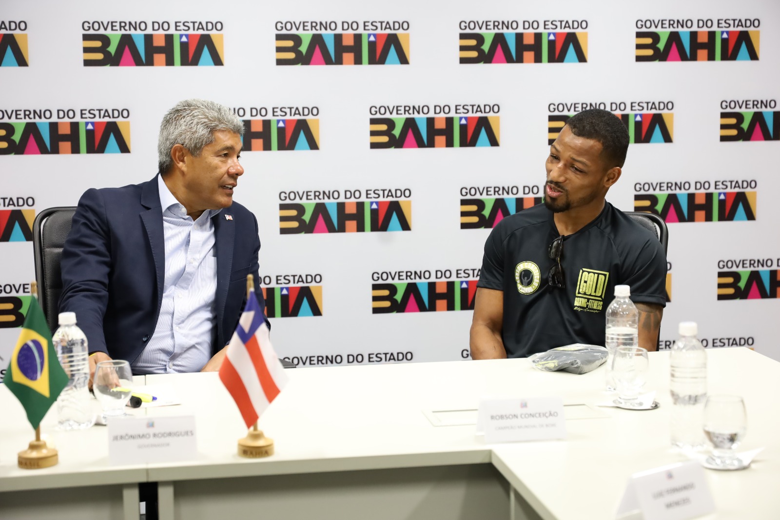 Mais novo campeão mundial de boxe, o baiano Robson Conceição foi recepcionado, nesta terça (9), no gabinete do governador Jerônimo Rodrigues.
