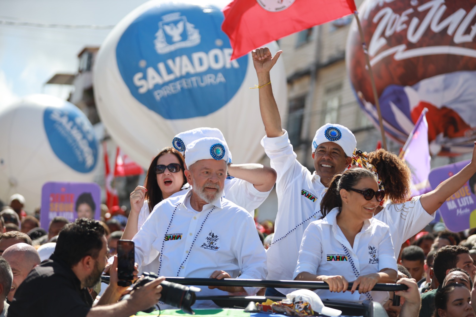 Acompanham o cortejo, junto com o presidente, o vice-governador Geraldo Júnior, a primeira-dama do Brasil, Janja Silva, e a primeira-dama da Bahia, Tatiana Velloso.