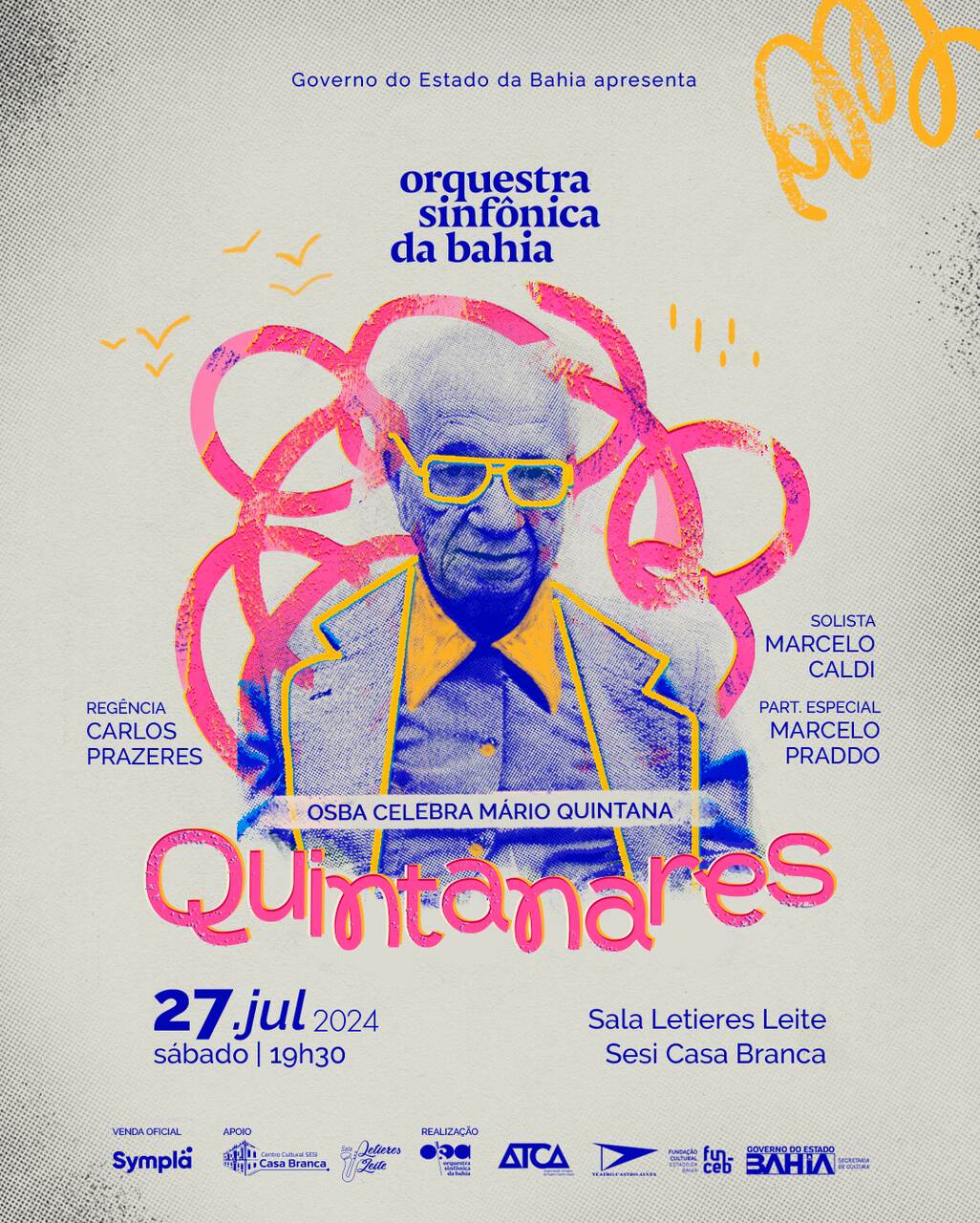 No dia 27 de julho, um sábado, a Orquestra Sinfônica da Bahia realiza o concerto Quintanares - Osba celebra Mário Quintana, às 19h30, na Sala Letieres Leite, localizada no Sesi Casa Branca (bairro Caminho de Areia, na Cidade Baixa).