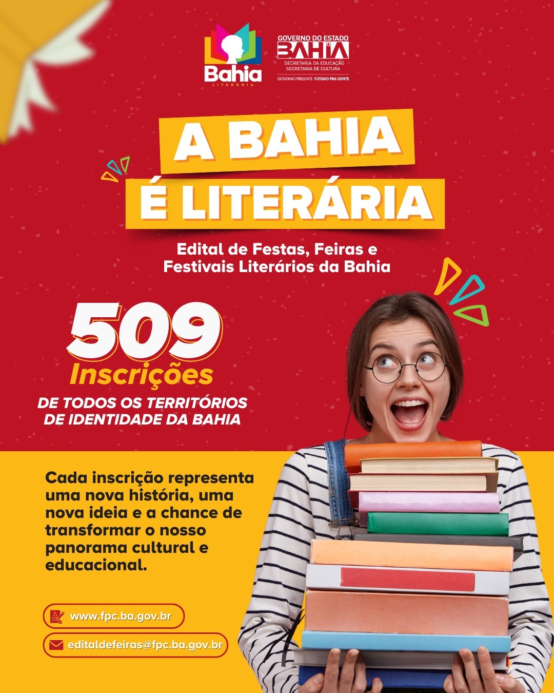 Lançado pelo Governo do Estado, por meio da Fundação Pedro Calmon e das secretarias estaduais de Cultura e da Educação, o Edital de Festas, Feiras e Festivais Literários abriu inscrições no dia 1º de julho. Os proponentes tiveram até a última quarta-feira (14) para enviar as propostas. A seleção superou a meta e alcançou um total de 509 inscrições dos 27 territórios de identidade da Bahia.