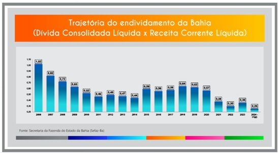 Em contraste com o expressivo valor investido na ampliação da infraestrutura e da prestação de serviços aos cidadãos, o endividamento do Estado da Bahia segue entre os menores do país: a dívida consolidada líquida encerrou o último exercício equivalendo a 26% da receita corrente líquida. Trata-se do mais baixo patamar de endividamento registrado desde que a Lei de Responsabilidade Fiscal (LRF) entrou em vigor, no ano 2000.