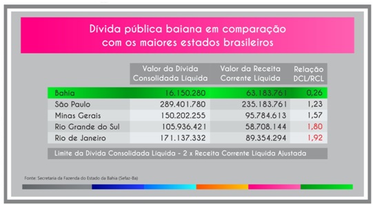 O número situa o governo baiano em patamar confortável com relação aos parâmetros da LRF, segundo a qual a dívida de um Estado não pode ultrapassar o limite de duas vezes a sua receita, ou seja, 200%. A situação contrasta com a dos maiores estados do país, que têm dívidas acima de 100% da receita: a do Rio de Janeiro corresponde a 192%, a do Rio Grande do Sul a 180%, a de Minas Gerais a 157% e a de São Paulo a 123%.