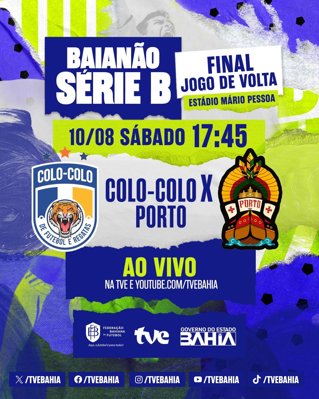Neste sábado (10), o Colo Colo e o Porto disputam o jogo que definirá o novo campeão da segunda divisão do Campeonato Baiano de Futebol. Os clubes, que garantiram seu acesso à elite do futebol baiano em 2025, se enfrentam às 17h45 (pré-jogo), no Estádio Mario Pessoa, em Ilhéus. Os torcedores podem acompanhar ao vivo pela TVE e também pelo youtube.com/tvebahia.