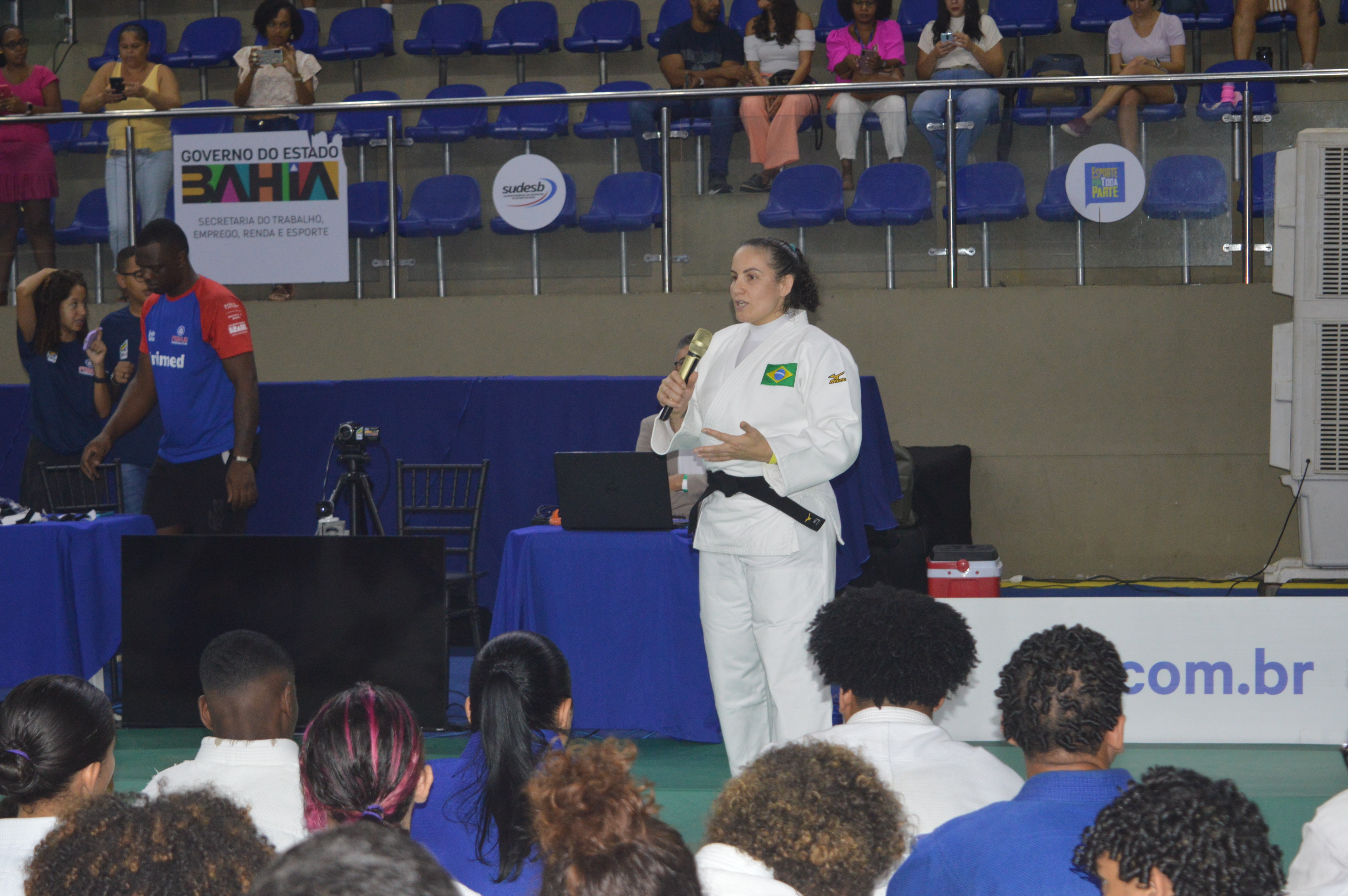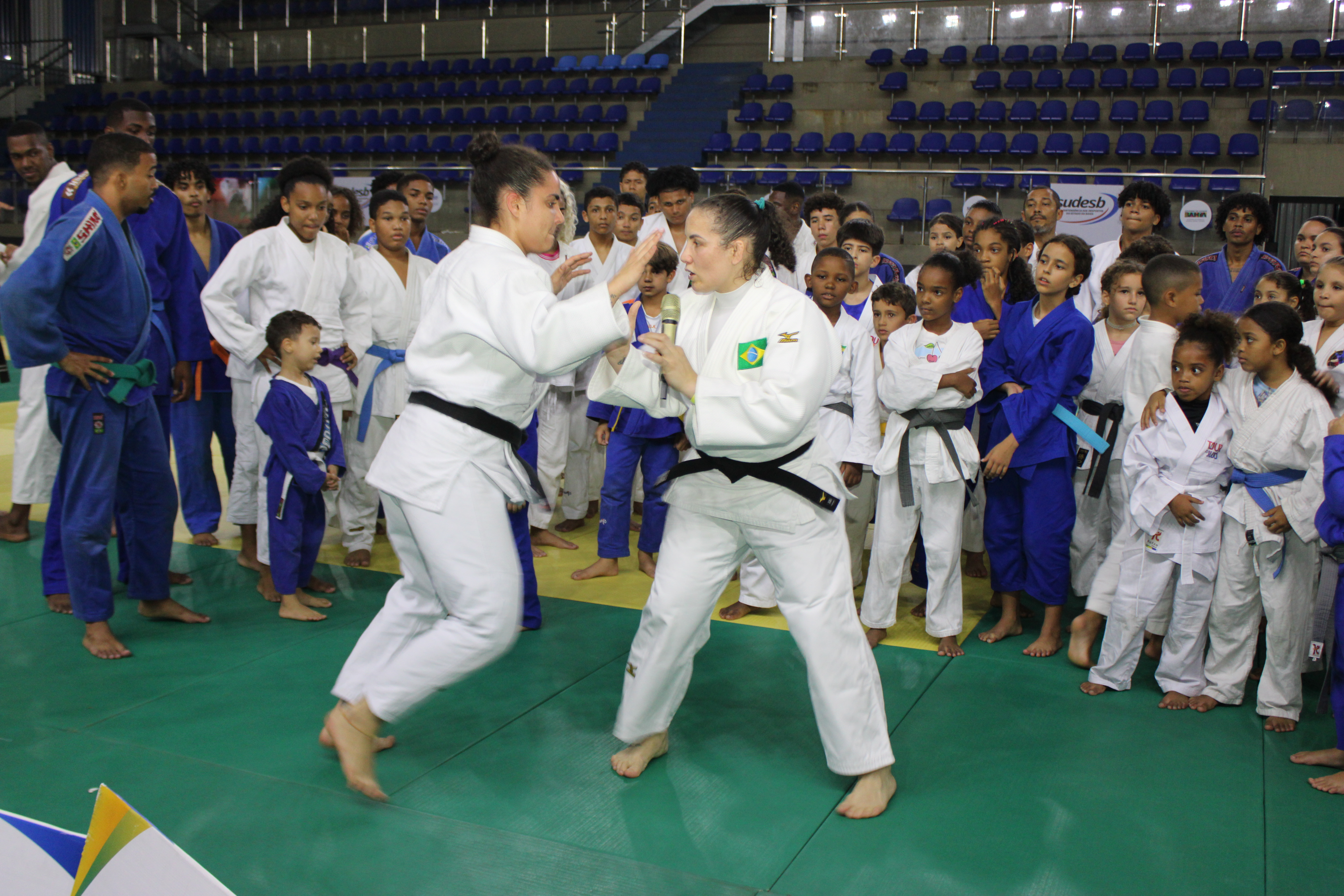 A ex-atleta da Seleção Brasileira de Judô, Maria Portela, fez um aulão inaugural para o início do Campeonato Brasileiro de Judô Sub-21 Individual e por Equipes 2024 na última sexta-feira (9) na Arena de Esportes da Bahia, em Ipitanga, Lauro de Freitas. A atividade recebeu cerca de 200 crianças e adolescentes do Projeto Núcleo de Esportes de Lutas e Combate. O projeto, fruto da parceria entre a Superintendência dos Desportos do Estado da Bahia (Sudesb), autarquia da Secretaria do Trabalho, Emprego, Renda e Esporte (Setre), e as federações estaduais das modalidades contempladas, acontece nos três equipamentos da autarquia estadual na Região Metropolitana de Salvador: a Arena de Esportes; o Centro de Boxe e Artes Marciais da Bahia, no largo de Roma; e o Ginásio Poliesportivo de Cajazeiras.