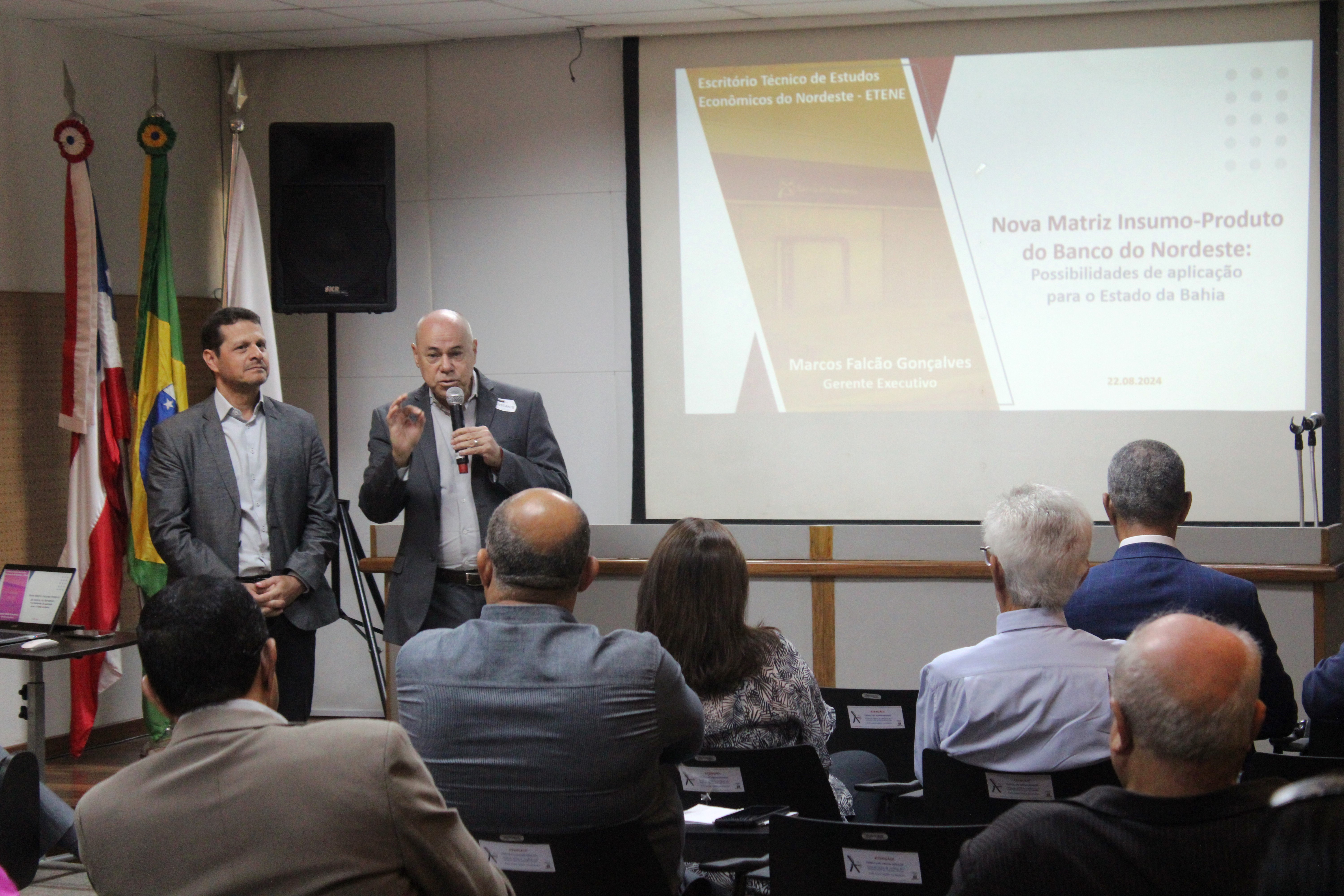 A Matriz de Insumo-Produto do Nordeste, um instrumento que possibilita uma série de estudos na área econômica, como impactos sobre emprego, arrecadação, preços, renda, exportações e produção, bem como suas possíveis aplicações no Estado da Bahia, foi apresentada no auditório da Secretaria Estadual do Planejamento (Seplan), nesta quinta-feira (22), pelo Escritório Técnico de Estudos Econômicos do Nordeste (Etene) do Banco do Nordeste. Entre os presentes estavam os secretários estaduais do Planejamento, Cláudio Peixoto, e de Trabalho, Emprego, Renda e Esporte, Davidson Magalhães, além de gestores e técnicos das quatro superintendências que compõem a Seplan, o diretor-geral da Superintendência de Estudos Econômicos e Sociais da Bahia (SEI), José Acácio Ferreira, e representantes da Secretaria de Desenvolvimento Econômico (SDE).
