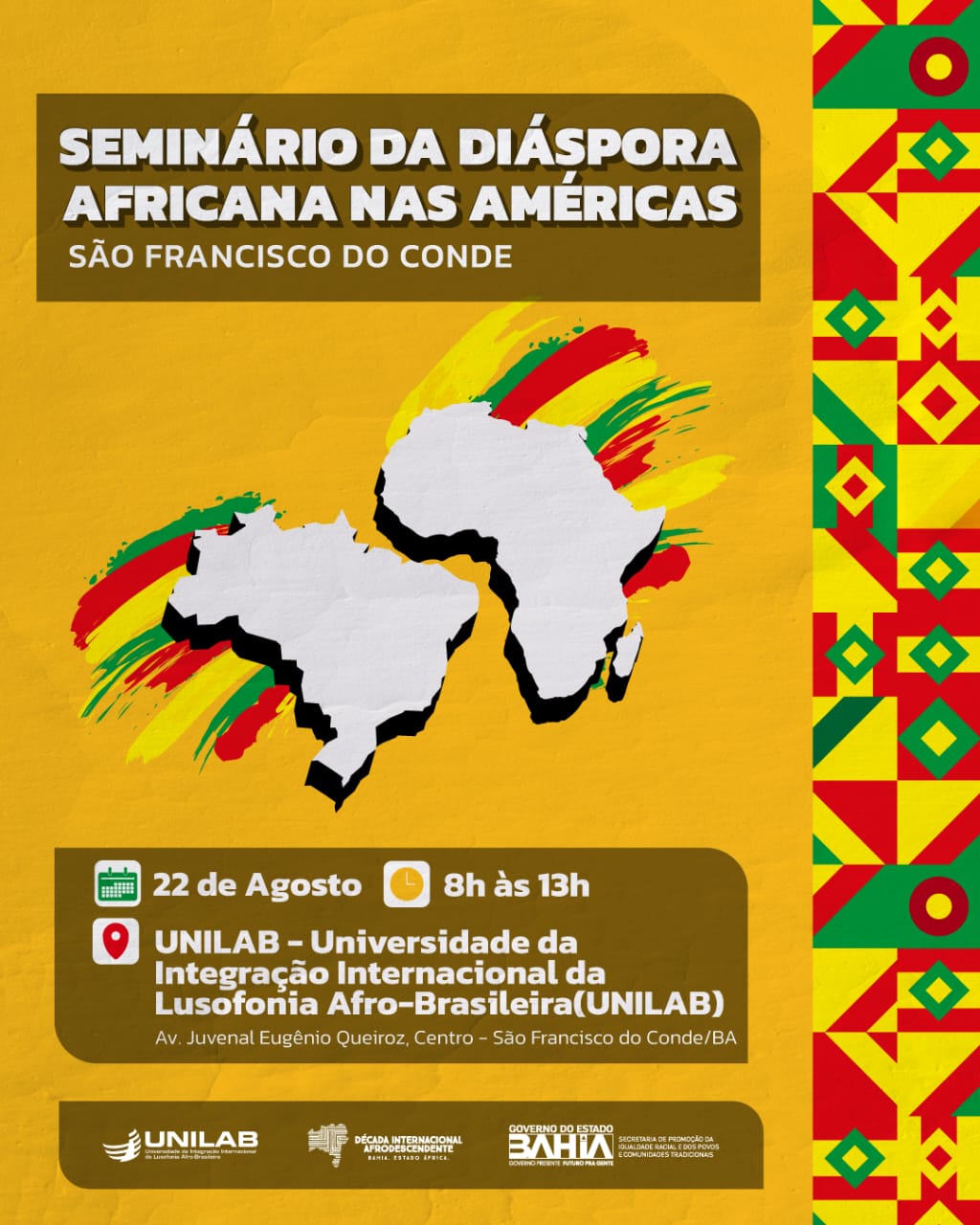 Nesta quinta-feira (22), das 8h às 13h, será realizada mais uma edição do Seminário da Diáspora Africana nas Américas, desta vez na Universidade da Integração Internacional da Lusofonia Afro-Brasileira (Unilab) – Campus dos Malês, em São Francisco do Conde. O evento, organizado pela Secretaria de Promoção da Igualdade Racial e dos Povos e Comunidades Tradicionais (Sepromi) em parceria com a Unilab, terá como tema “A universidade pública no debate panafricanista sobre memória, restituição, reparação e reconstrução”.