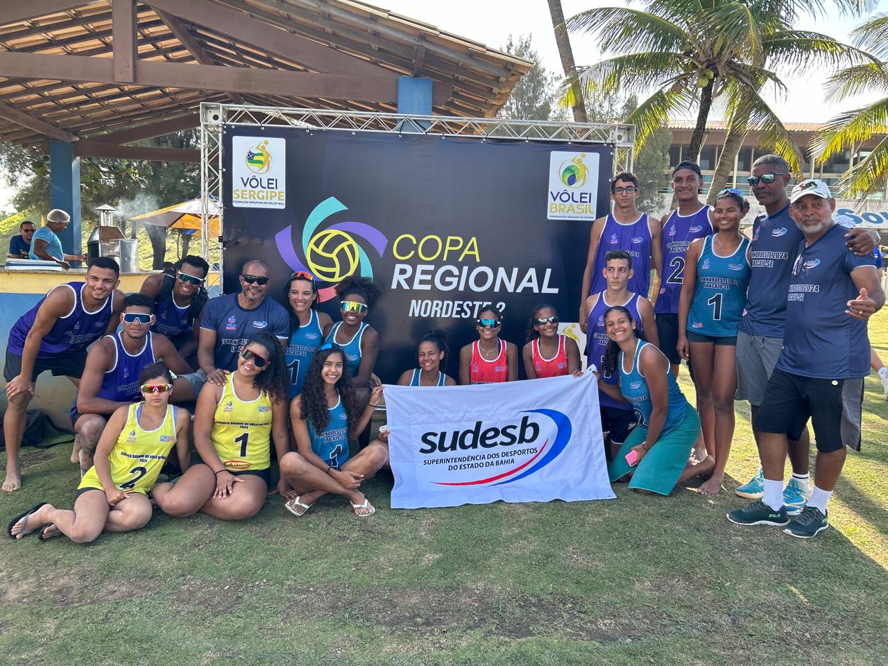 Quatro duplas da Bahia chegaram às semifinais na Copa Nordeste de Vôlei de Praia Sub-23 Regional 2, com direito a uma medalha de ouro e outra de bronze no feminino. A Delegação Baiana de Vôlei de Praia Sub-23 (atletas, árbitros e coordenadores) viajou com transporte concedido pela Superintendência dos Desportos do Estado da Bahia (Sudesb), autarquia da Secretaria do Trabalho, Emprego, Renda e Esporte (Setre), para a competição que aconteceu entre sexta-feira (16), e domingo (18) em Aracaju, Sergipe. Cerca de 30 pessoas da Federação Baiana de Voleibol (FBV) integraram a Delegação.