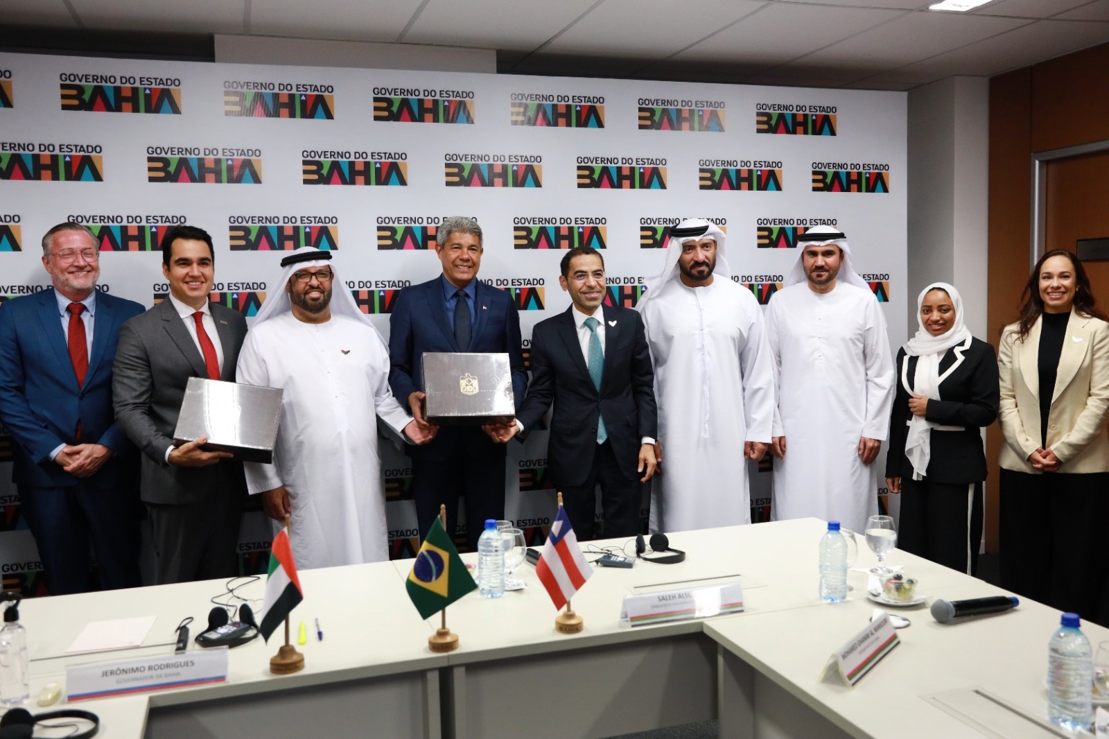O governador Jerônimo Rodrigues recebeu, na manhã desta quarta-feira (18), o embaixador dos Emirados Árabes Unidos, Saleh Alsuwaidi, e representantes da Al Foah Company para discutir os próximos passos de uma parceria com a empresa para o plantio inédito de tâmaras em solo brasileiro. O Brasil já recebeu 110 mudas de tamareira, que estão na Empresa Brasileira de Pesquisa Agropecuária (Embrapa), em Brasília, aguardando o tempo de observação sanitária da planta para posterior teste nas regiões norte e oeste do estado.