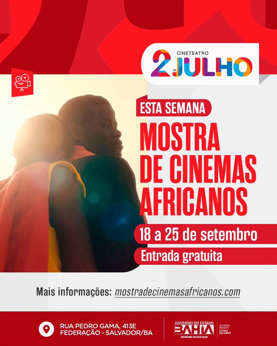 O festival acontece em várias cidades do Brasil desde 2018, e neste ano a programação soteropolitana é marcada pelo inédito Encontro Audiovisual Brasil-África, com cerca de 50 profissionais do audiovisual africano e brasileiro, além de atividades como cursos, bate-papos e laboratório crítico. O evento conta ainda com tradução simultânea e acessibilidade em libras. As informações estão disponíveis no site da mostra, no link mostradecinemasafricanos.com.