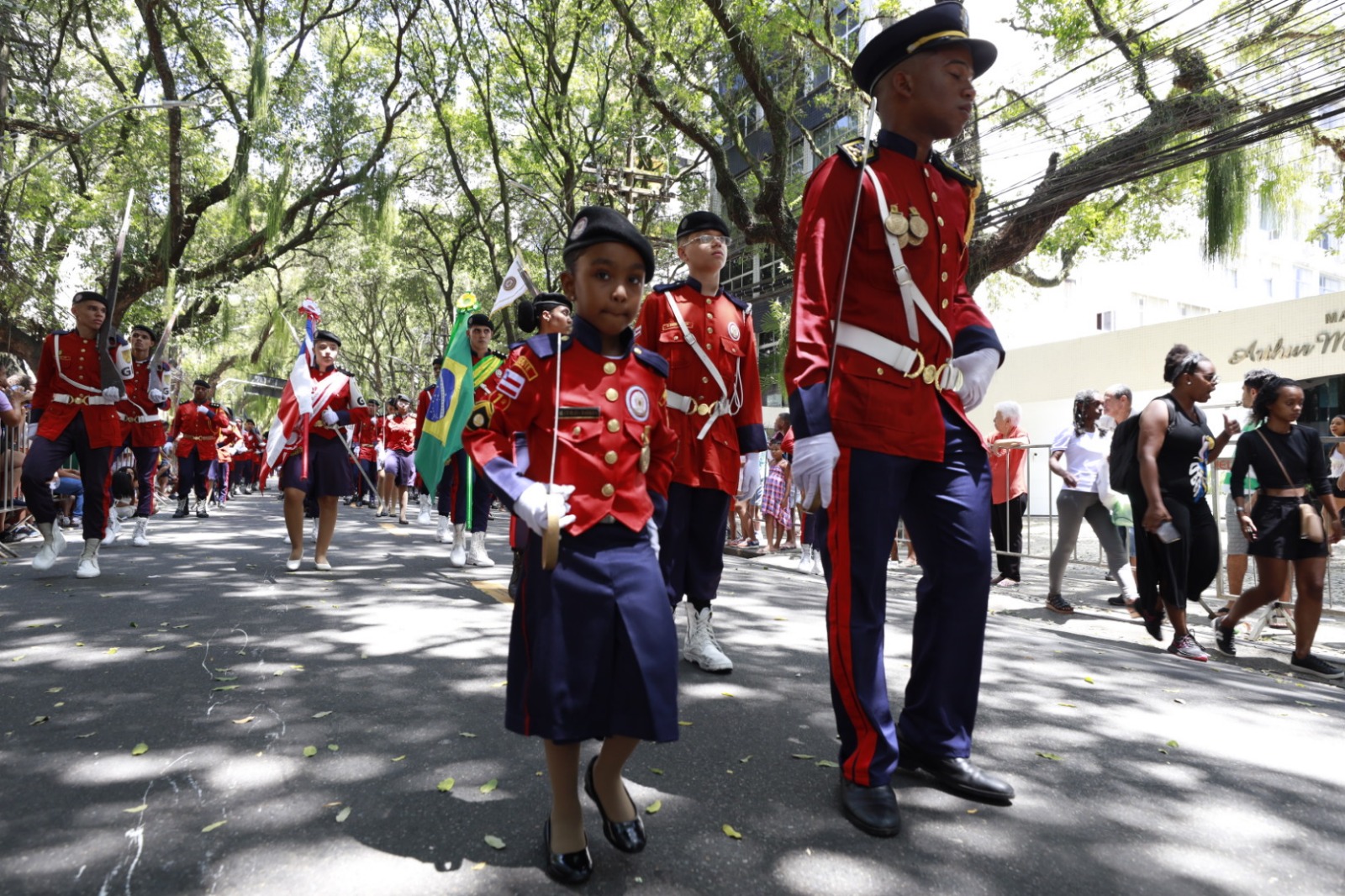 As fanfarras escolares da rede estadual de ensino, policiais e bombeiros militares tomaram as ruas do centro de Salvador durante a realização do Desfile Cívico do 7 de Setembro, quando o Brasil celebra 202 anos da independência de Portugal. As comemorações foram iniciadas no Corredor da Vitória, com o hasteamento das bandeiras, que contou com a participação de diversas autoridades.