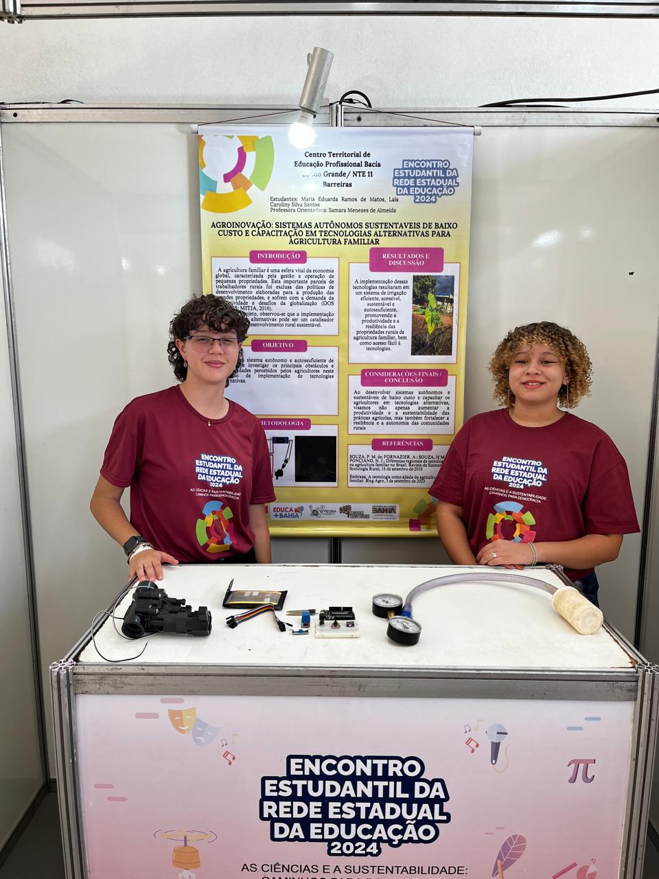 Maria Eduarda Ramos de Matos, 18 anos, aluna do 3º ano do Centro Territorial de Educação Profissional da Bacia do Rio Grande, está exibindo o projeto "Agroinovação: sistemas autônomos sustentáveis de baixo custo e capacitação em tecnologias alternativas voltadas à Agricultura Familiar". O objetivo do trabalho é propor tecnologias alternativas para pequenos produtores aumentarem sua produtividade e sustentabilidade.