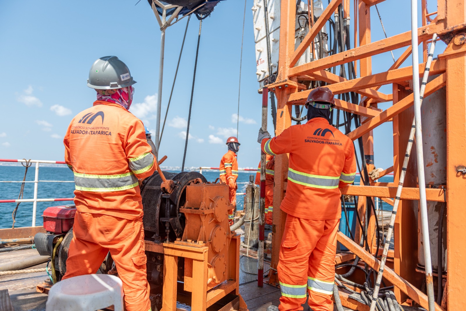 Ao mesmo tempo em que duas balsas seguem em ação nas águas profundas, está em andamento, também, a sondagem em águas rasas, até 10 metros de profundidade, com uso de uma plataforma estilo Jackup. Elas fazem parte de uma força-tarefa que está coletando amostras do fundo do mar em 102 pontos da Baía, onde serão erguidos os pilares da Ponte Salvador-Itaparica.