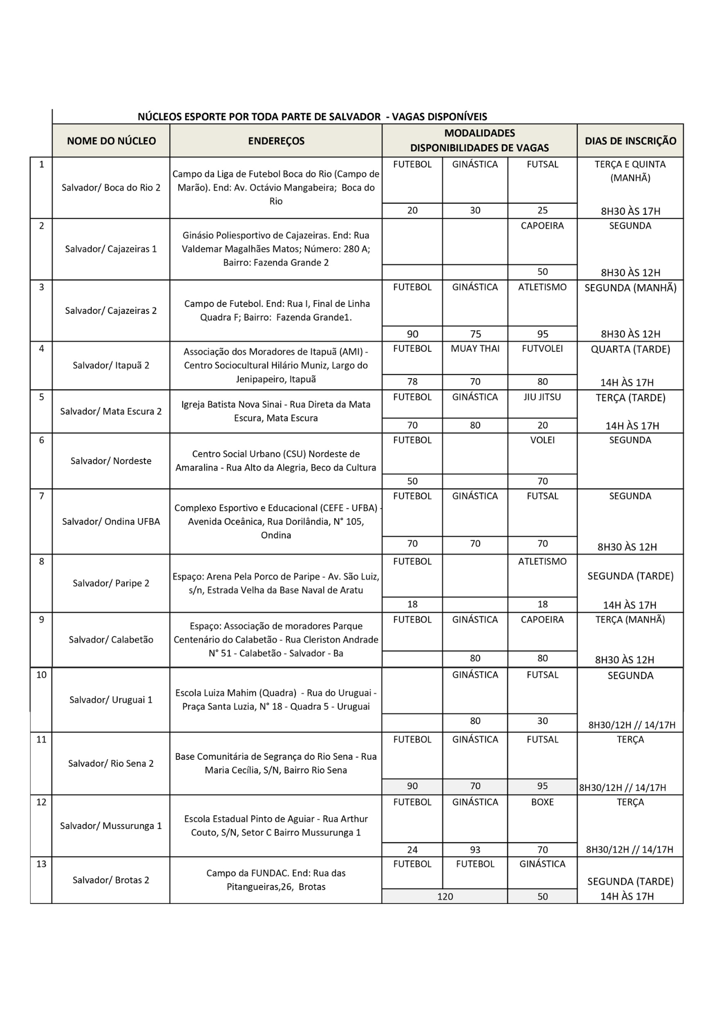 Futebol, futsal, muay-thai, jiu-jitsu, boxe, capoeira, atletismo, futevôlei, vôlei e ginástica para adulto são as modalidades ofertadas e distribuídas em núcleos da Boca do Rio, Cajazeiras, Itapuã, Mata Escura, Nordeste, Ondina, Paripe, Calabetão, Uruguai, Rio Sena, Mussurunga e Brotas (quadro por modalidade e número de vagas abaixo. As mesmas permanecerão abertas até preenchimento do número disponível em cada núcleo).