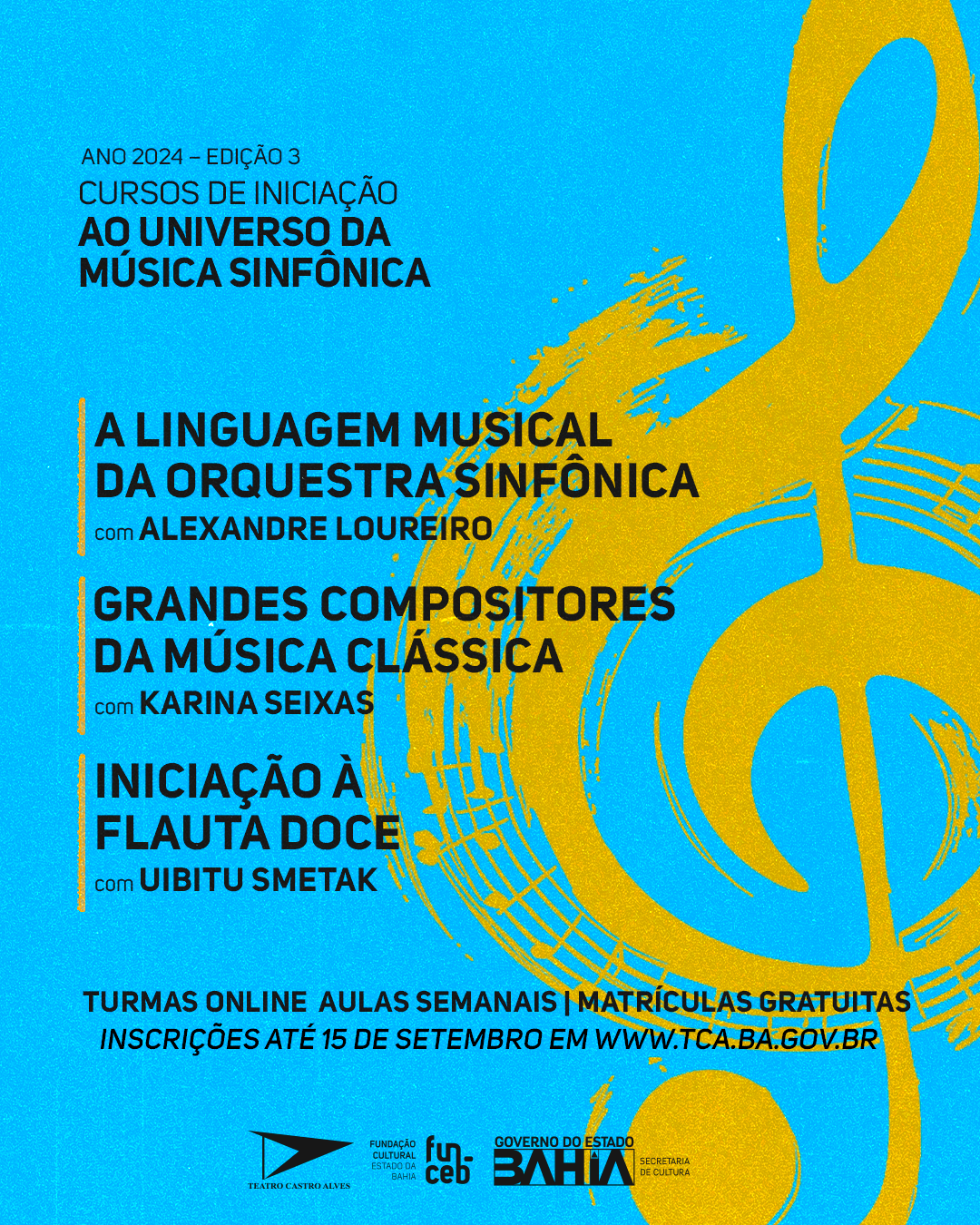 Os cursos de iniciação à música sinfônica do Teatro Castro Alves (TCA) encerram a jornada 2024 com novas turmas de setembro a dezembro. Com encontros na modalidade online, os cursos podem contemplar alunos de várias cidades da Bahia e do Brasil. As aulas, que serão realizadas entre 23 de setembro e 20 de dezembro, têm como público-alvo pessoas maiores de 15 anos que desejam adentrar neste rico mundo: não é necessário conhecimento prévio, o propósito é justamente de introdução à apreciação musical e à prática de instrumento. Os interessados devem garantir vaga, por ordem de inscrição, até 15 de setembro, através de preenchimento de formulário disponível no site http://www.tca.ba.gov.br. Todos os cursos são gratuitos.