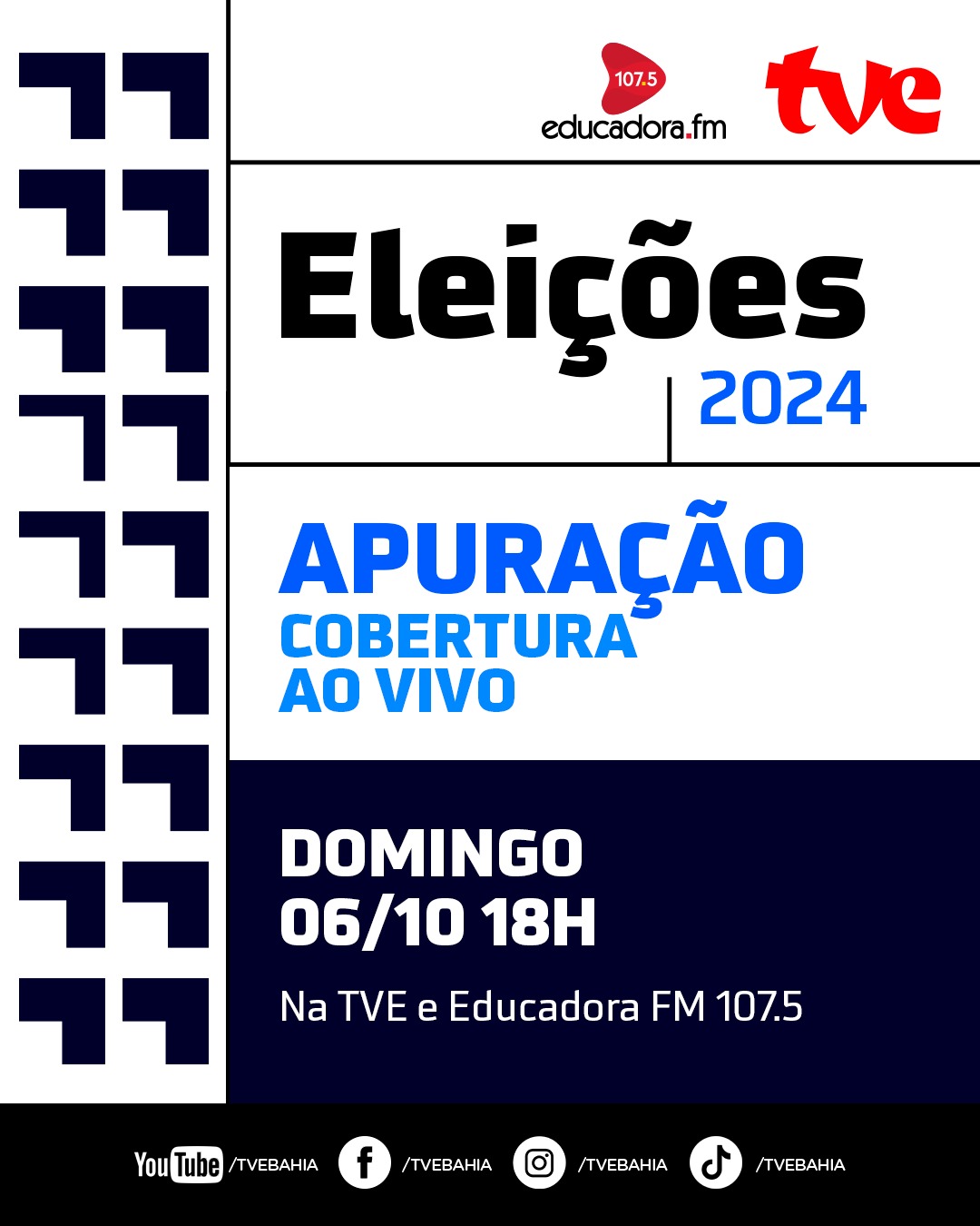 Neste domingo (6) os eleitores baianos votam para escolher prefeitos(as) e vereadores(as) das 417 cidades baianas. A TVE realiza a cobertura das eleições 2024, com informações ao longo do dia sobre a votação e os resultados. A transmissão começa com a abertura dos locais de votação às 8h e segue até o resultado final com um programa ao vivo a partir das 18h.