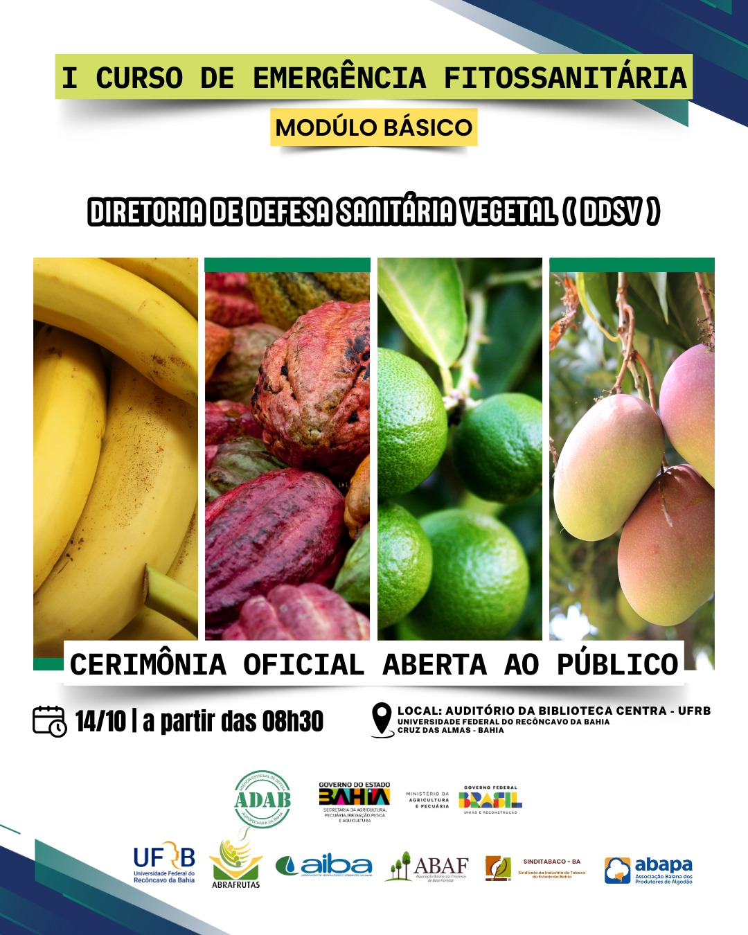 A Agência de Defesa Agropecuária da Bahia (Adab), através da Diretoria de Defesa Sanitária Vegetal (DDSV), promove entre os próximos dias 14 e 18 de outubro, em Cruz das Almas, o primeiro Curso de Emergência Fitossanitária (Módulo Básico). O objetivo é capacitar profissionais e técnicos da Agência e de instituições parcerias e garantir maior agilidade e assertividade na resposta a eventuais emergências sanitárias, fundamentais para a redução dos possíveis danos causados por pragas e doenças.