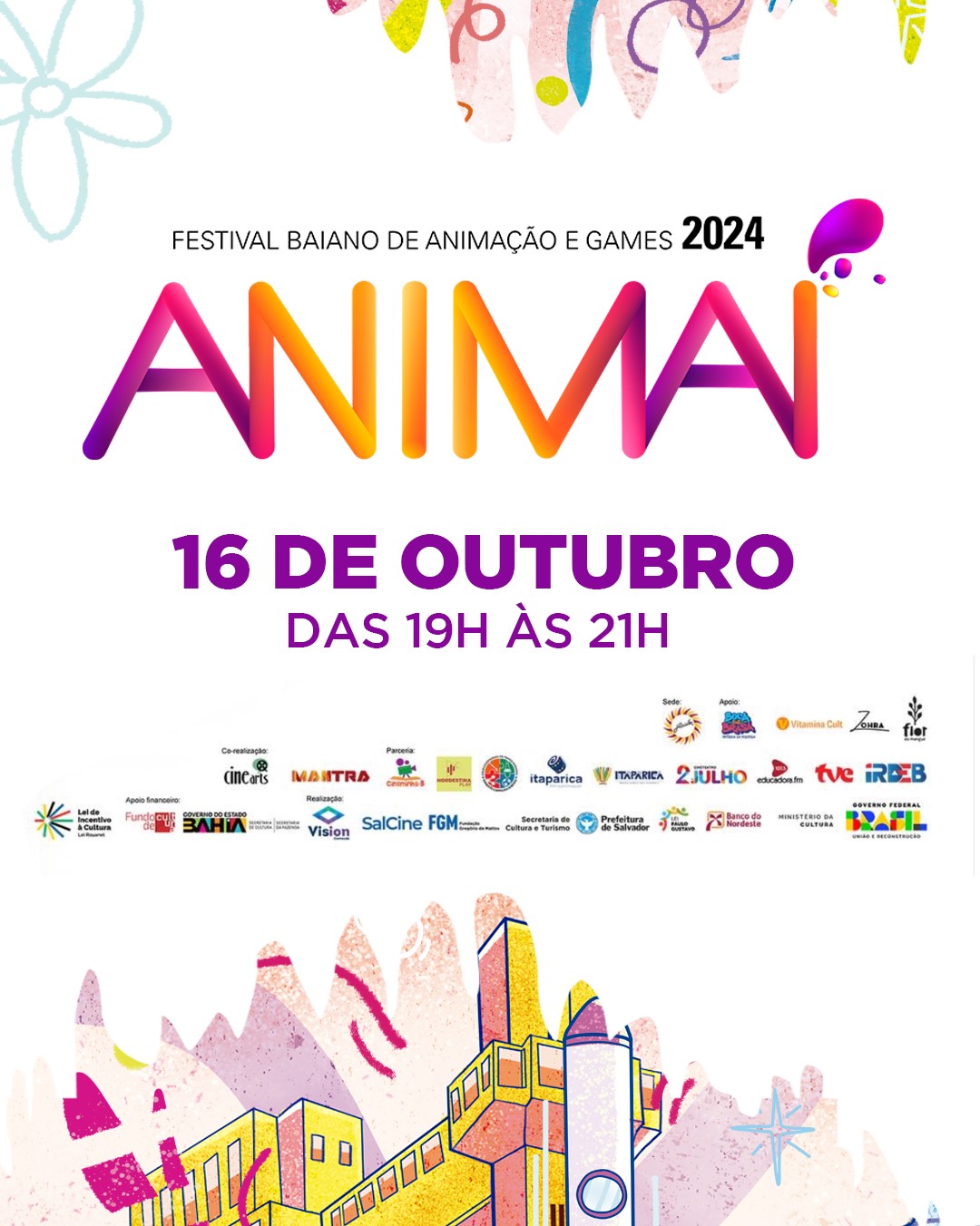 O Festival tem programação inteiramente gratuita composta por workshops, palestras, seminários, exposições de artistas ilustradores e mostras competitivas de filmes de animação e jogos eletrônicos. O evento acontece em Salvador dos dias 16 a 19, na Sala de Arte do MAM e no Subúrbio 360, em Itaparica, de 22 a 25, no Colégio Estadual Carneiro Ribeiro, e circula por 16 cidades baianas até o final do ano, retornando para o Cineteatro 2 de Julho entre 5 e 8 de dezembro. A programação e outras informações podem ser conferidas no instagram do festival, no link instagram.com/animai.festival.