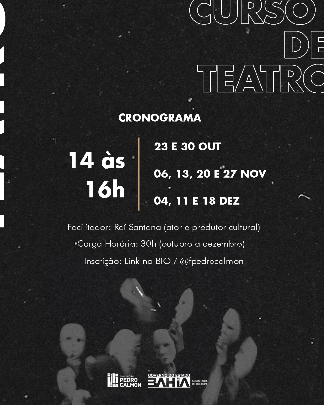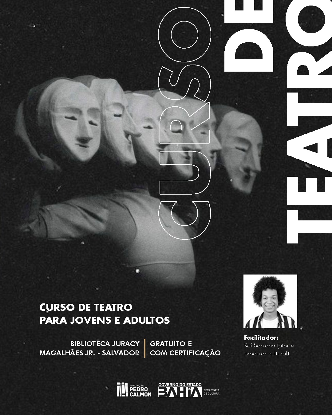A Fundação Pedro Calmon (FPC), vinculada à Secretaria de Cultura da Bahia (SecultBA), promove curso de teatro para jovens e adultos na Biblioteca Juracy Magalhães Júnior – Salvador. O curso acontece nos dias 23 e 30 de outubro - 6, 13, 20 e 27 de novembro e 4, 11 e 18 de dezembro, às quartas-feiras, das 14h às 16h.