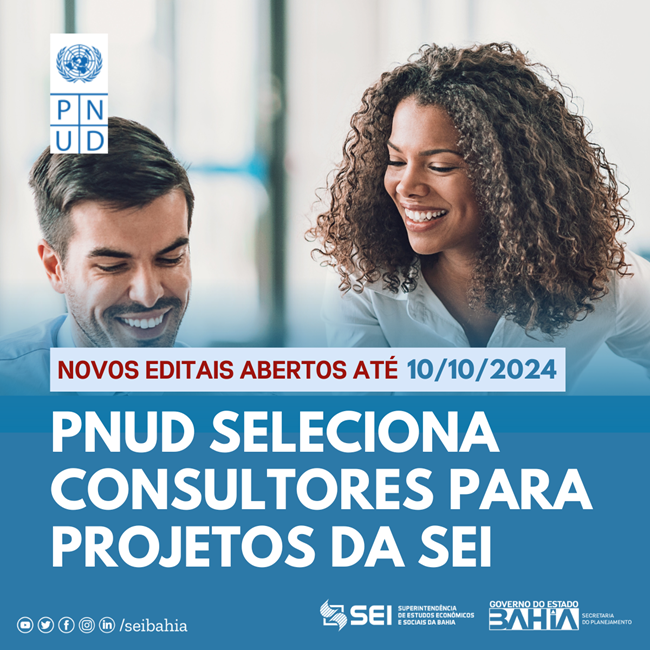 O Programa das Nações Unidas para o Desenvolvimento (PNUD) publicou dois novos editais para contratação de consultores individuais pessoa física, na modalidade Produto, fruto de cooperação técnica internacional com a Superintendência de Estudos Econômicos e Sociais da Bahia (SEI).