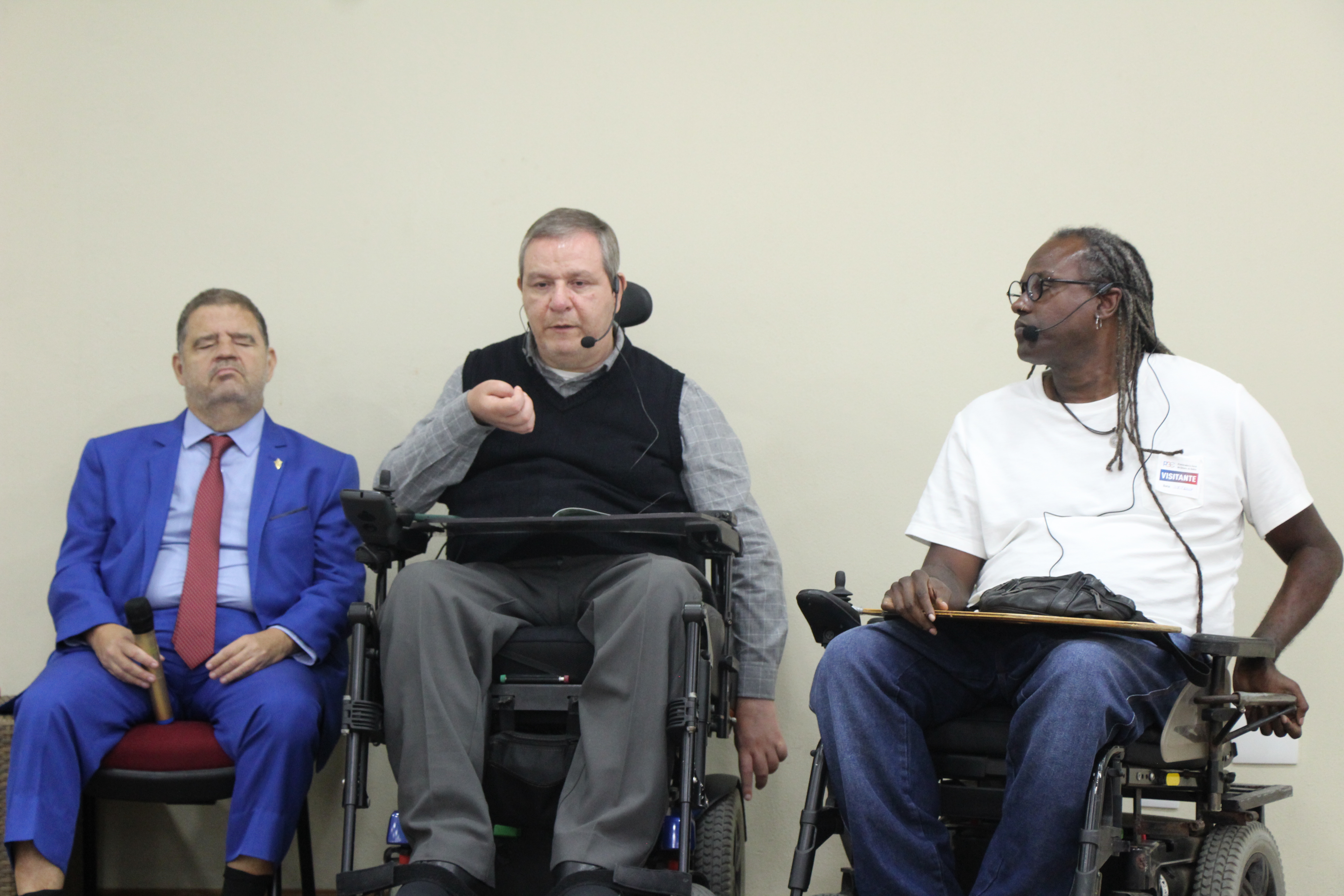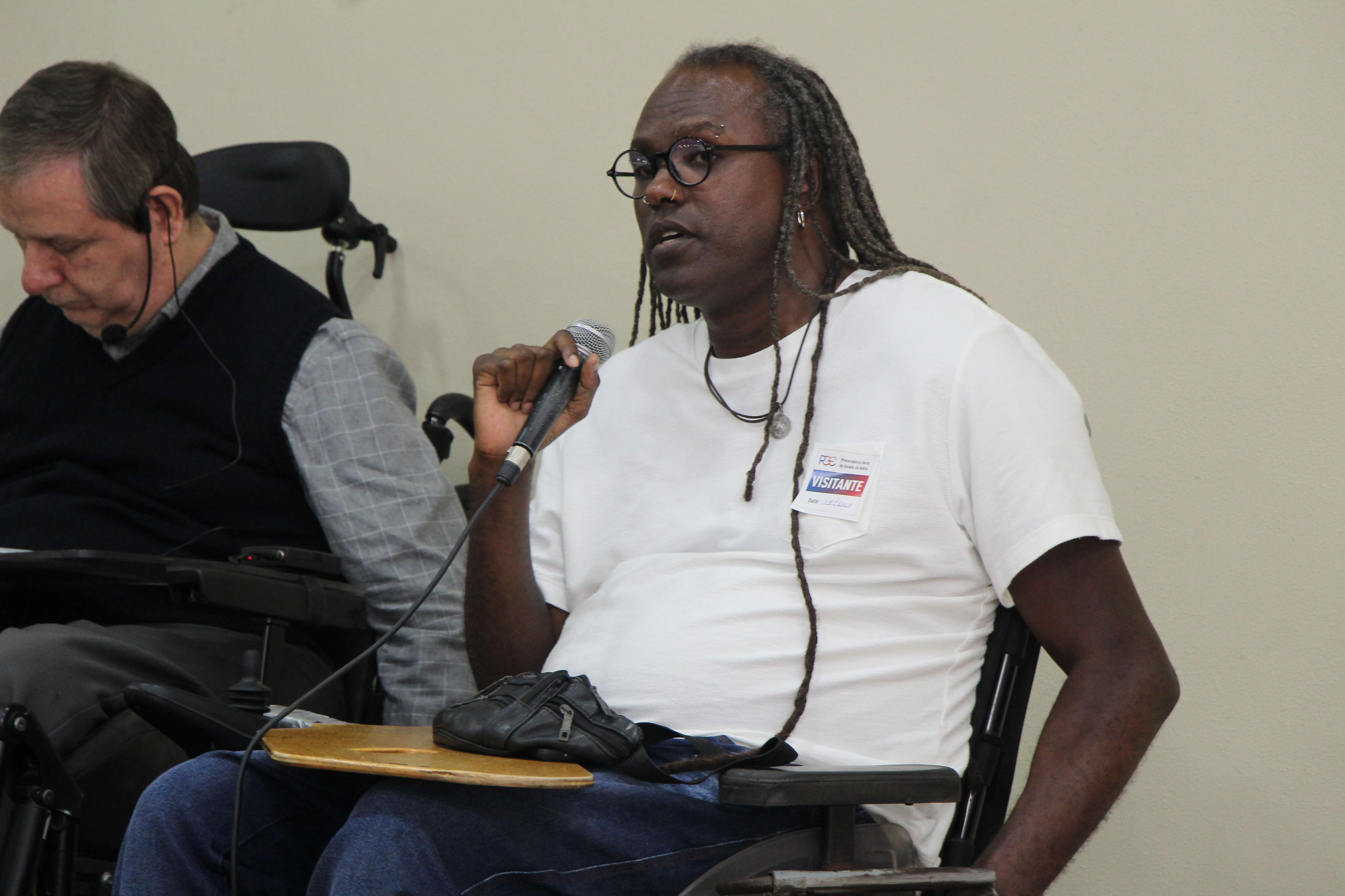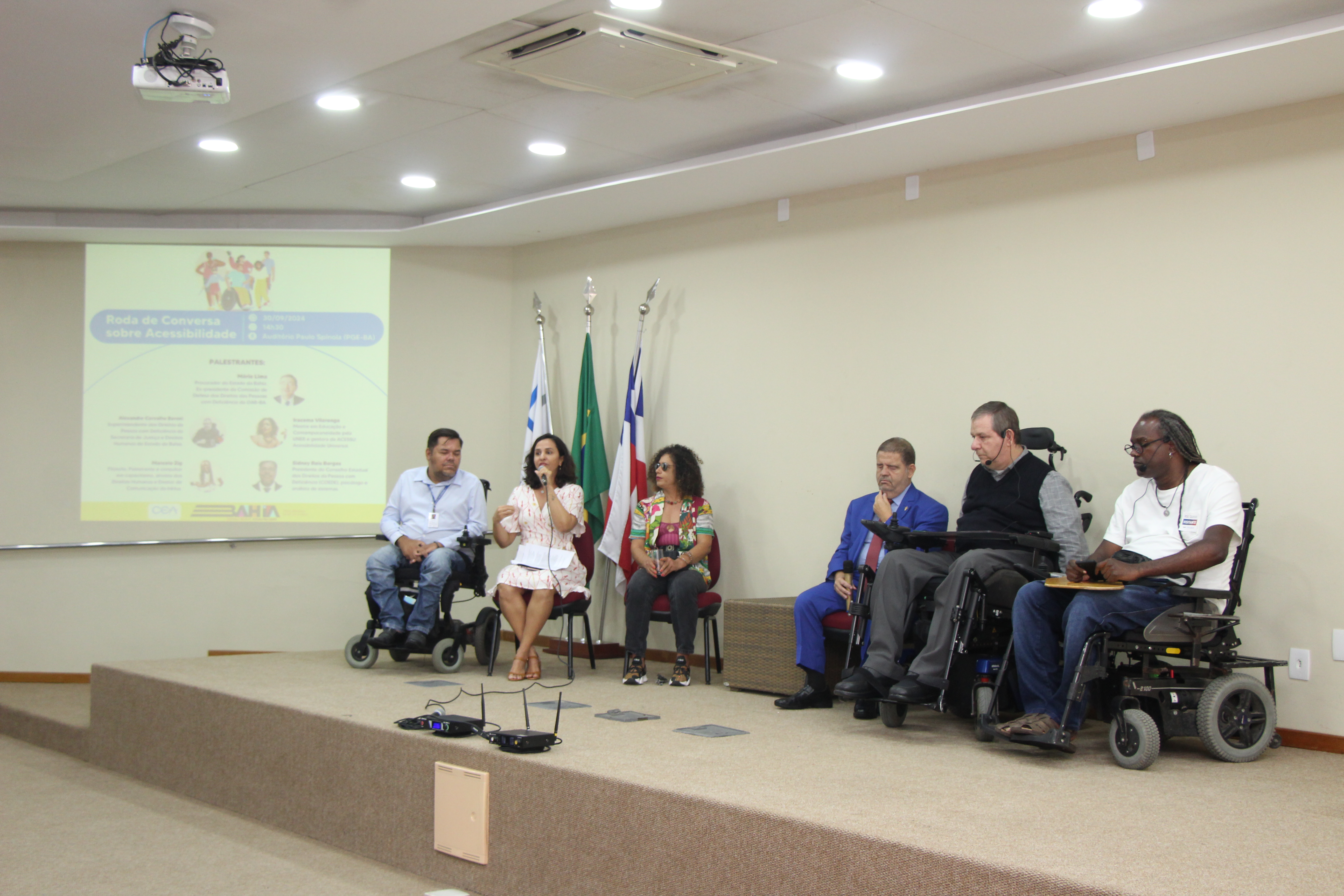 A roda de conversa teve como palestrantes o superintendente dos Direitos da Pessoa com Deficiência da Secretaria de Justiça e Direitos Humanos da Bahia (Sudef/SJDH), Alexandre Baroni; o procurador do Estado da Bahia, Mário Lima, que também é ex-presidente da Comissão de Defesa dos Direitos das Pessoas com Deficiência da Ordem dos Advogados do Brasil - Seção Bahia (OAB-BA); a mestre em Educação e Contemporaneidade pela Universidade do Estado da Bahia (Uneb), e gestora da Acessu - Acessibilidade Universal, Iracema Vilaronga; o filósofo, palestrante e consultor em capacitismo, ativista dos Direitos Humanos e Diretor de Comunicação da Inklua, Marcelo Zig; e o presidente do Conselho Estadual dos Direitos da Pessoa com Deficiência (Coede), psicólogo e analista de sistemas, Sidney Borges.