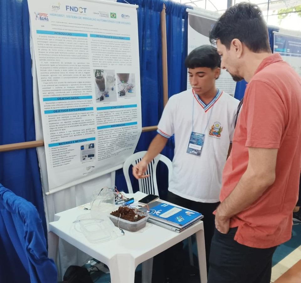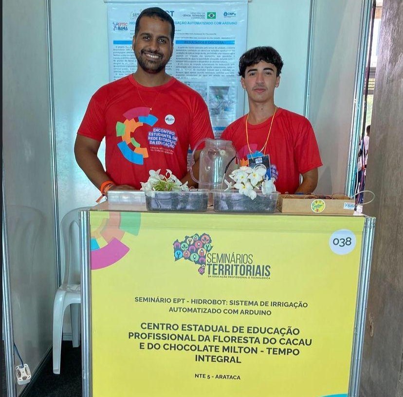 No Território de Identidade do Litoral Sul (NTE 5), o Centro Estadual de Educação Profissional da Floresta do Cacau e do Chocolate Milton Santos, localizado em Arataca, foi destaque na categoria Projeto de Ciências com o “Hidrobot - irrigador automatizado com arduino” dos estudantes Smenio da Silva Santos e Wendel de Souza Rodrigues.