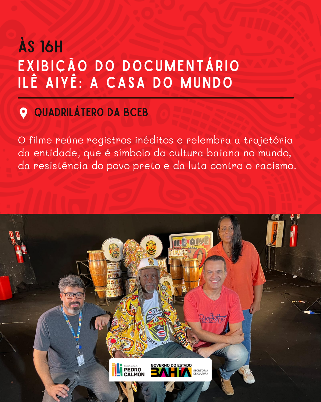No dia 27 de novembro, a partir das 16h, além da exibição de ‘Ilê Aiyê: a casa do mundo’, com a presença dos jornalistas Ricardo Ishmael e Alexandre Lyrio, coordenadores do documentário, a Biblioteca Virtual Consuelo Pondé em parceria com a Biblioteca Central do Estado da Bahia, promove a abertura da exposição: Ilê Aiyê: 50 anos de Resistência Cultural e Ação Educacional e o 1º Ciclo de Palestras – Ecoando a Resistência: 190 Anos da Revolta dos Malês – Legados e Lutas Contemporâneas.