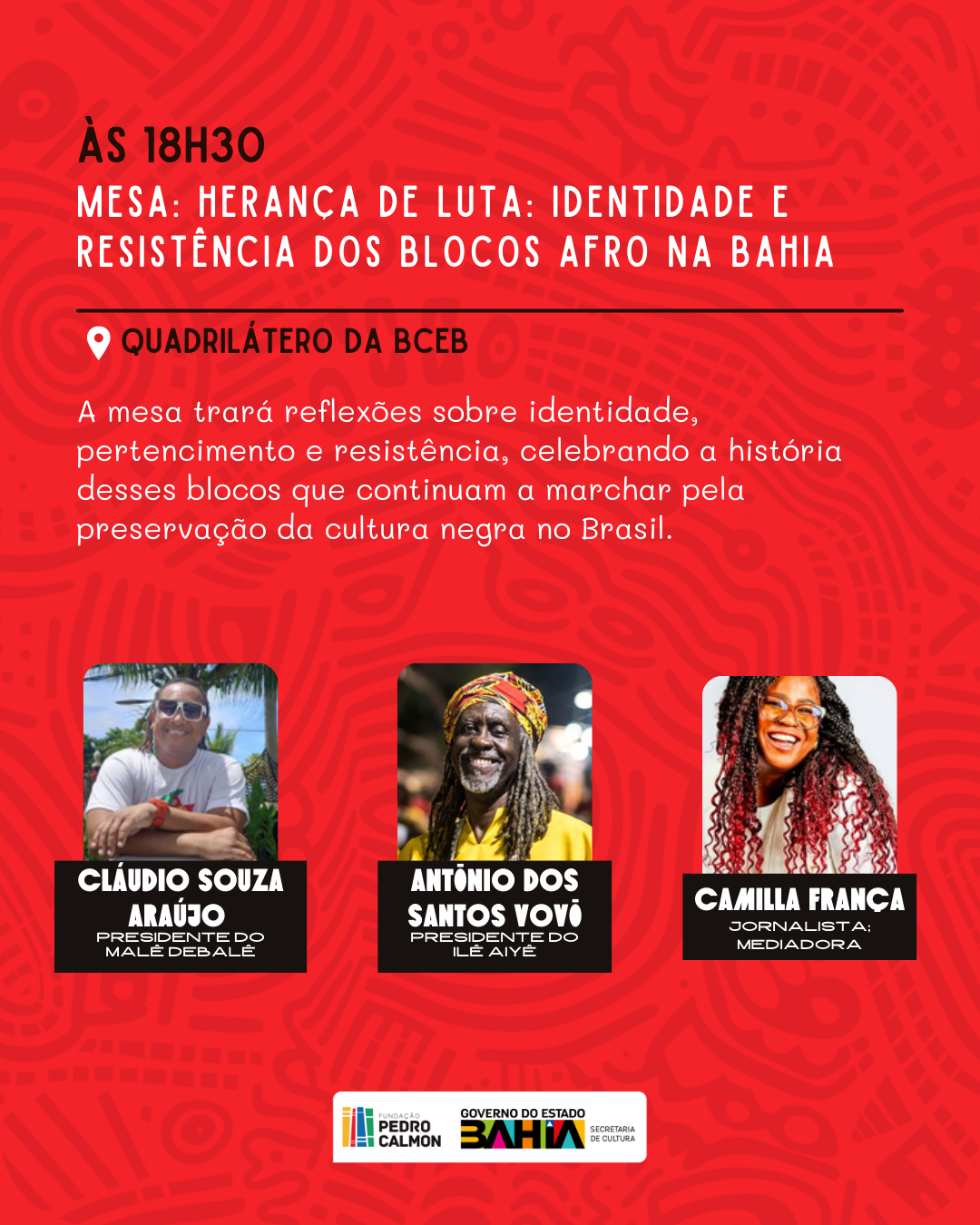 Na mesma data acontece a mesa ‘Herança de Luta: Identidade e Resistência dos Blocos Afro na Bahia’, que contará com Cláudio Souza Araújo, presidente do Malê Debalê, e Antônio dos Santos Vovô, presidente do Ilê Aiyê, trazendo reflexões sobre identidade, pertencimento e resistência, celebrando a história desses blocos que resistem pela preservação da cultura negra no Brasil. A mesa será mediada por Camilla França, jornalista e mestre em Cultura e Sociedade pela Universidade Federal da Bahia (Ufba).