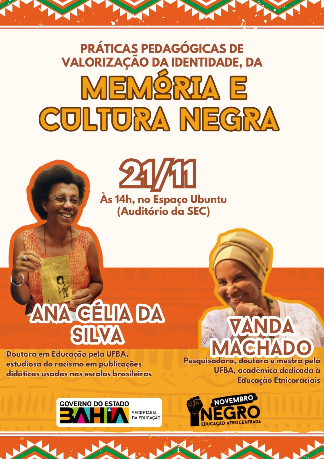 Como parte das comemorações do Novembro Negro, a Secretaria da Educação do Estado (SEC) promove, nesta quinta-feira (dia 21), às 14h, uma mesa de debate sobre o tema Práticas Pedagógicas de Valorização da Identidade, da Memória e Cultura Negra. O evento, que vai acontecer no Auditório da SEC, terá como palestrantes as professoras e pesquisadoras do tema Ana Célia Silva e Vanda Machado.