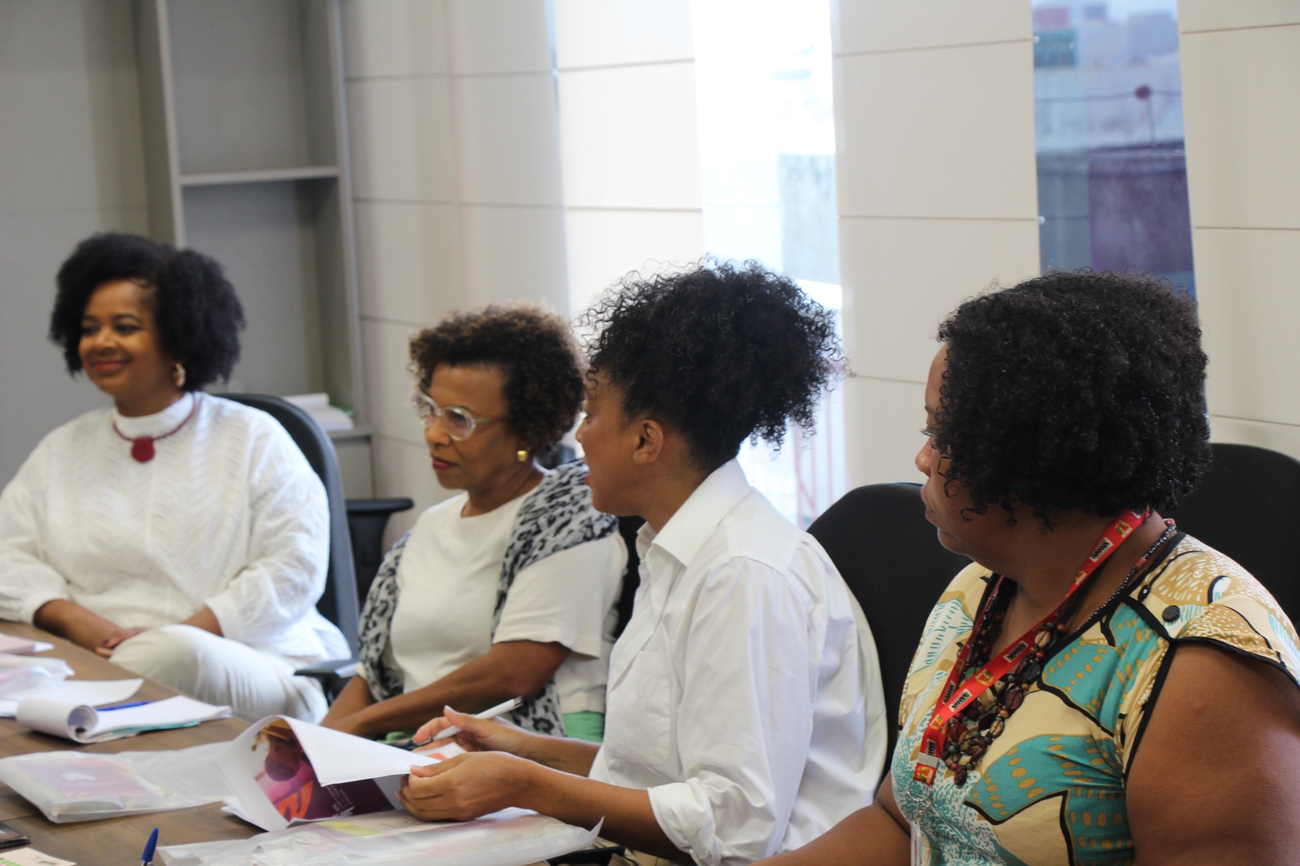 Participaram do encontro a superintendente de Apoio e Defesa aos Direitos Humanos da SJDH (SUDH), Trícia Calmon, acompanhada da coordenadora executiva, Lucinea Rocha; Carla Nogueira, coordenadora de jovens e adultos da SEC; Aline Teles, coordenadora do Sistema de Promoção da Igualdade Racial da Sepromi; Nivaldo Millet, coordenador da Cojuve, acompanhado da assessora Jéssica Ferreira; e as representantes do Seta, Luciana Ribeiro e Maria Corrêa.