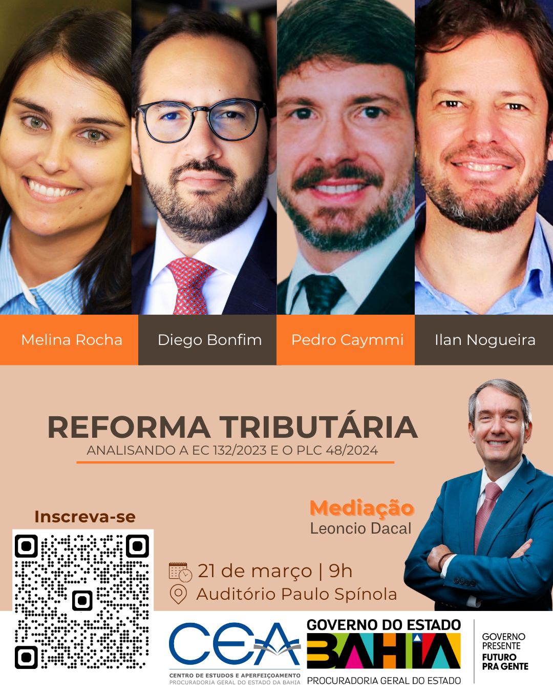 A programação abordará aspectos fundamentais da Reforma Tributária e contará com a participação de Melina Rocha, consultora do BID assessorando a Secretaria Extraordinária de Reforma Tributária (SERT) do Ministério da Fazenda; Diego Bonfim, presidente do Instituto de Direito Tributário da Bahia; Pedro Caymmi, professor de Direito Tributário e Financeiro da UFBA; e Ilan Nogueira, auditor fiscal e diretor da DICOP – Diretoria de Contabilidade Aplicada ao Setor Público. A mediação fica a cargo de Leoncio Dacal, Procurador do Estado da Bahia, mestre em Direito Tributário pela PUC/SP e membro do grupo de análise jurídica do PAT-RTC da SERT.