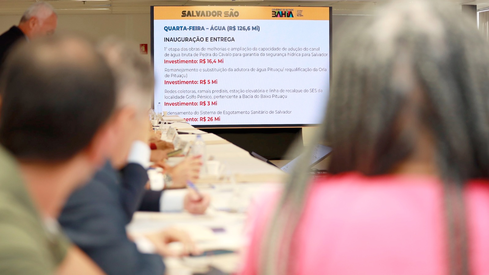 Por meio da Secretaria de Recursos Hídricos (Sihs), o Governo do Estado fará investimentos na ordem de R$ 126,6 milhões para contemplar a entrega de quatro obras, três ordens de serviço e uma autorização para licitação. As obras incluem a 1ª etapa das melhorias e ampliação da capacidade de adução do Canal de Água Bruta de Pedra do Cavalo, garantindo a segurança hídrica do SIAA Salvador, no valor de R$ 16,4 milhões, o remanejamento e substituição da adutora de água Pituaçu, dentro da requalificação da orla do bairro, com investimento de R$ 5 milhões, a execução de redes coletoras, ramais prediais, estação elevatória e linha de recalque do Sistema de Esgotamento Sanitário da localidade Golfo Pérsico, pertencente à Bacia do Baixo Pituaçu, em Salvador, no valor de R$ 3 milhões, e o adensamento do Sistema de Esgotamento Sanitário de Salvador, nos Lotes 3 e 4, no valor de R$ 26 milhões.