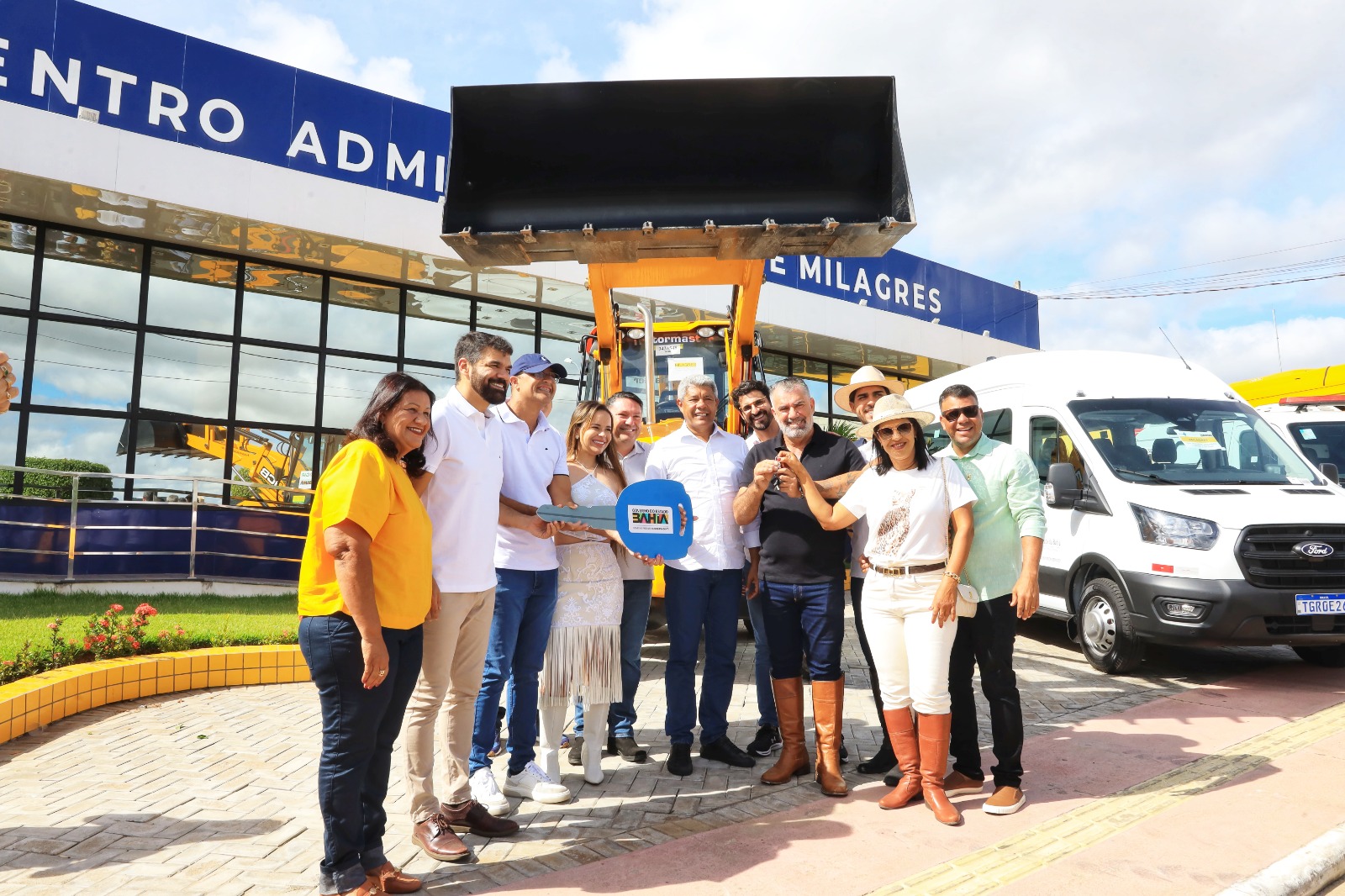 O município de Milagres recebeu, neste domingo (27), a visita do governador Jerônimo Rodrigues reforçando as ações que integram o compromisso do Governo do Estado com o fortalecimento dos serviços públicos e a valorização da cultura regional. Durante a agenda, foram entregues, respectivamente, por meio das secretarias de Saúde (Sesab), Educação (SEC) e Desenvolvimento Rural (SDR), via Companhia de Desenvolvimento e Ação Regional CAR), uma van para o Transporte Fora do Domicílio (TFD), que garantirá conforto e segurança aos pacientes que necessitam realizar tratamentos em outras localidades; uma retroescavadeira, equipamento que irá reforçar a infraestrutura e os serviços urbanos e rurais da cidade, além de um ônibus escolar para a comunidade estudantil.