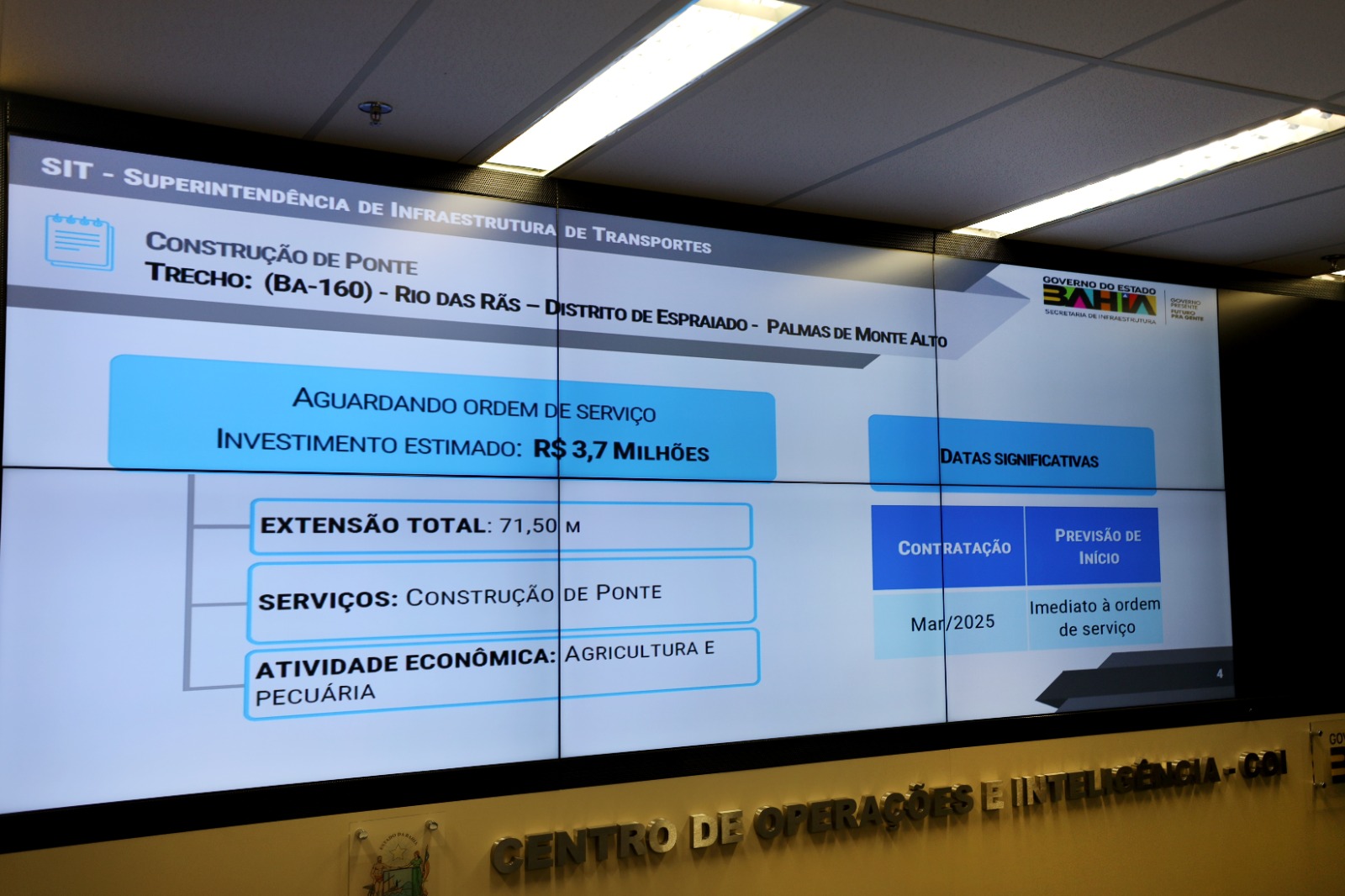 Nesta segunda-feira (5), durante reunião entre o governador Jerônimo Rodrigues e o prefeito de Palmas de Monte Alto, Marcos Túlio, foi assinada a ordem de serviço para a construção da ponte sobre o Rio das Rãs, ligando o distrito de Espraiado, no município, ao povoado de Vesperina, na cidade de Riacho de Santana. O investimento é de R$ 3,7 milhões. No encontro também foram feitas entregas para a área de saúde.