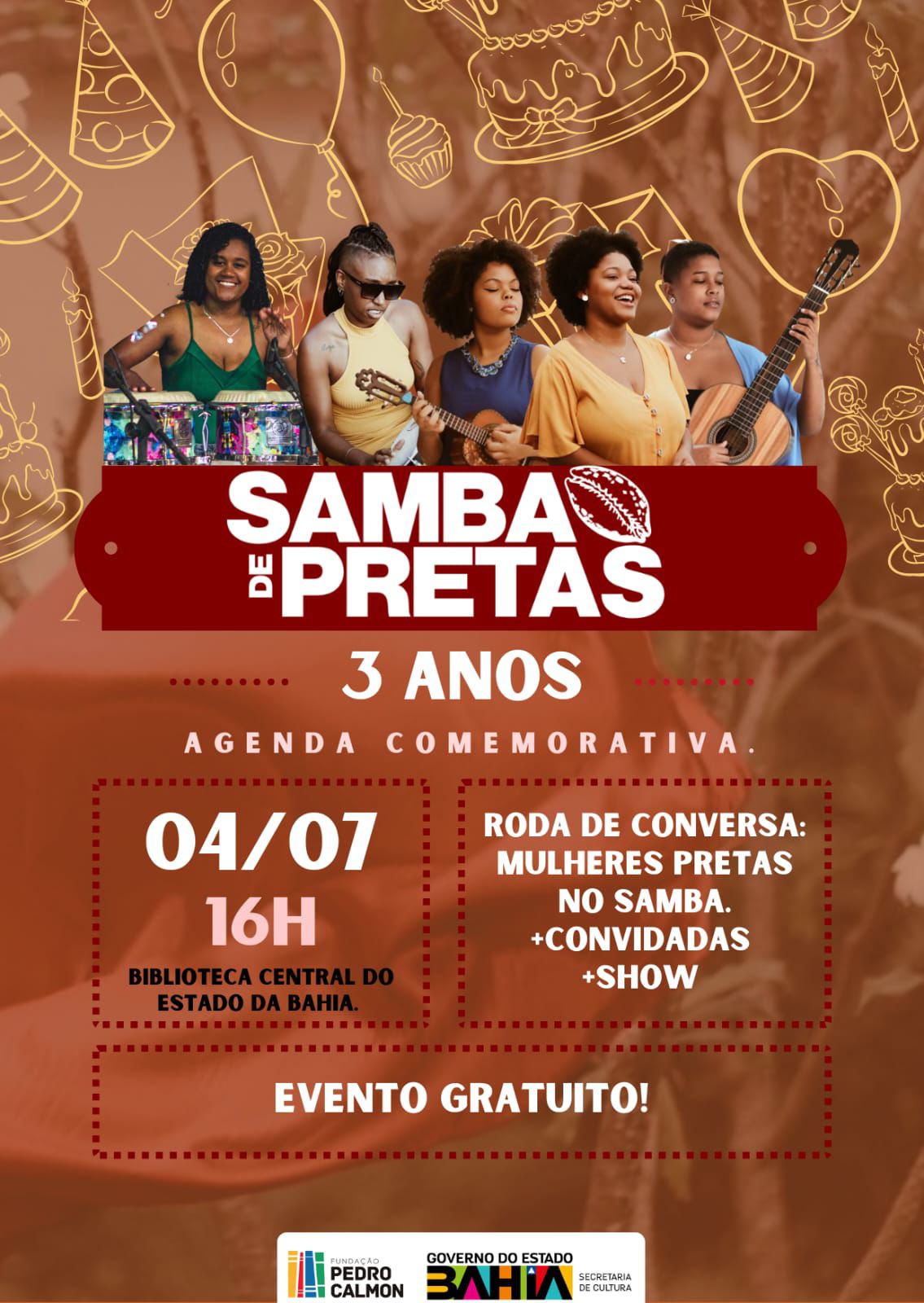 A Biblioteca Central do Estado da Bahia (BCEB), equipamento da Fundação Pedro Calmon (FPC), em parceria com o grupo Samba de Pretas, realizará o evento “3 anos de Samba: Mulheres Negras, Raiz e Ritmo”, em celebração ao aniversário da banda e como abertura da programação do Julho das Pretas.