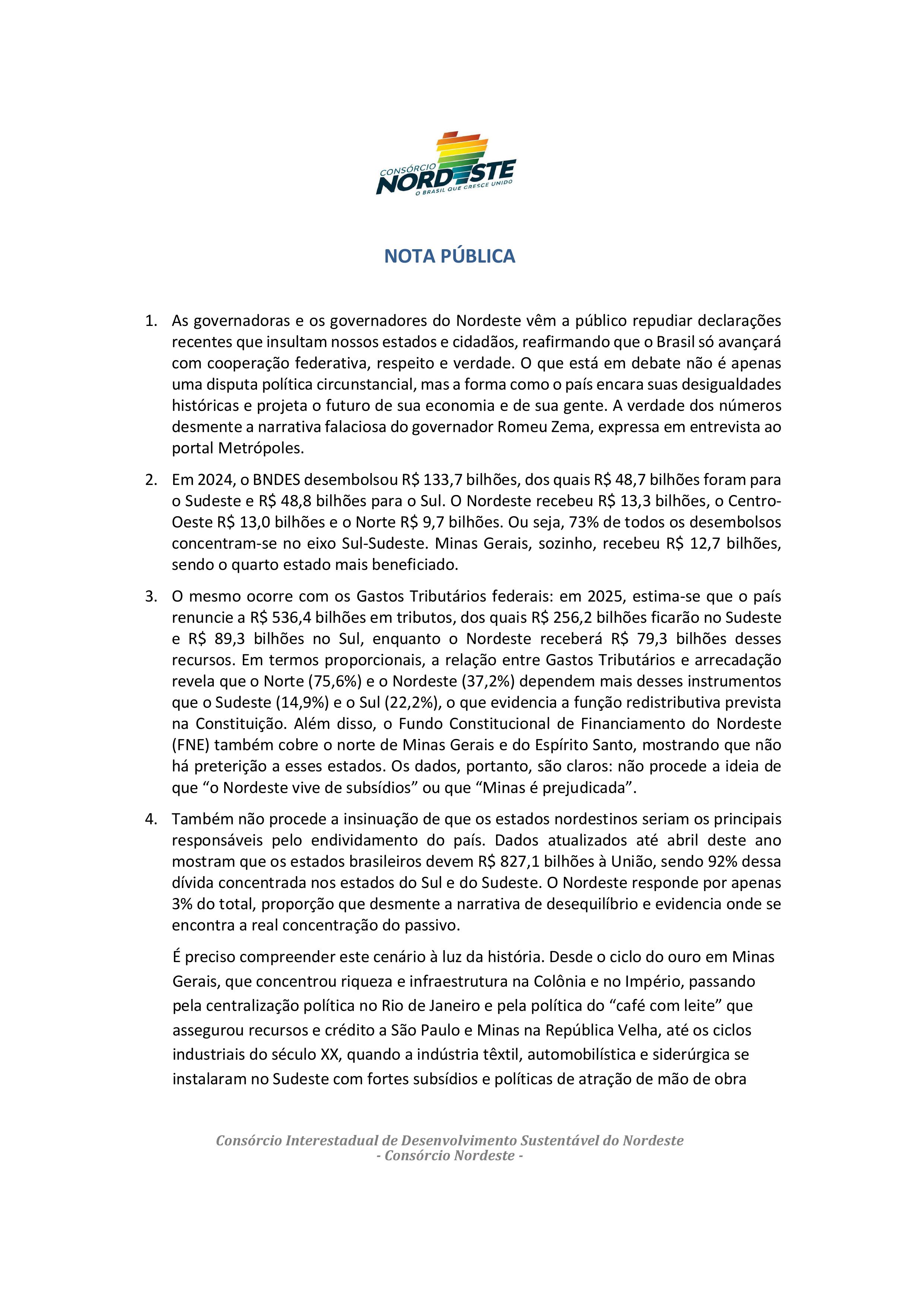 Esses dados não apenas desmontam a falácia de que o Nordeste viveria de “privilégios”, como também evidenciam a concentração histórica de investimentos no eixo Sul-Sudeste — desde o ciclo do ouro, passando pela industrialização subsidiada do século XX, até as atuais políticas de crédito. O Nordeste nunca buscou esmolas: luta, há décadas, por oportunidades justas de desenvolvimento e por políticas que valorizem suas potencialidades.